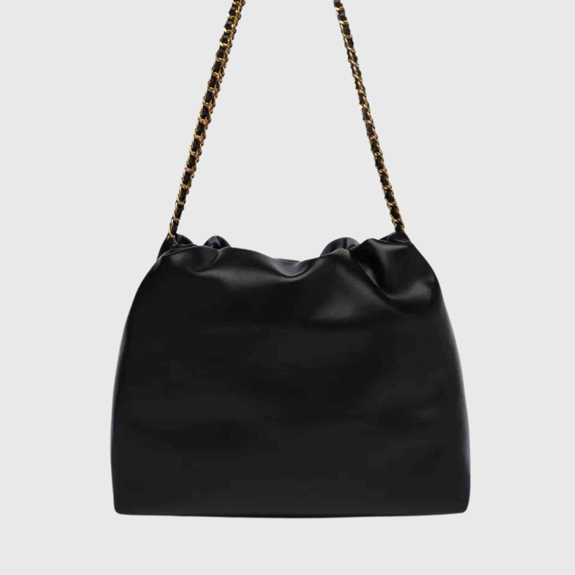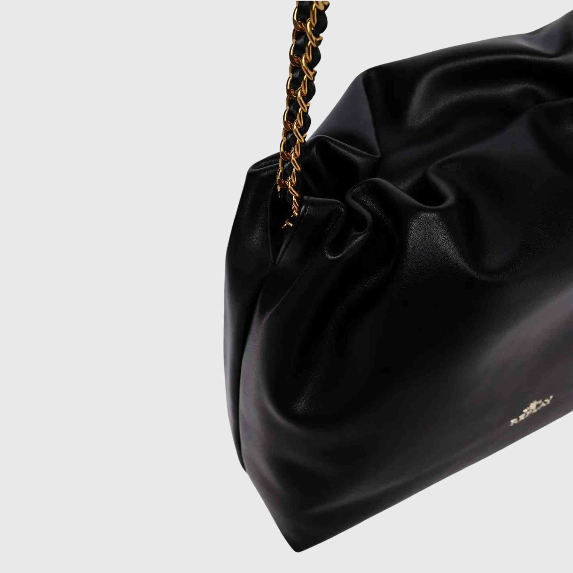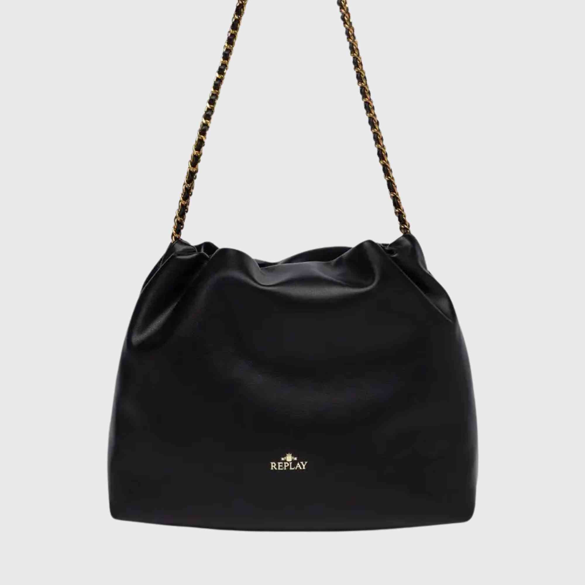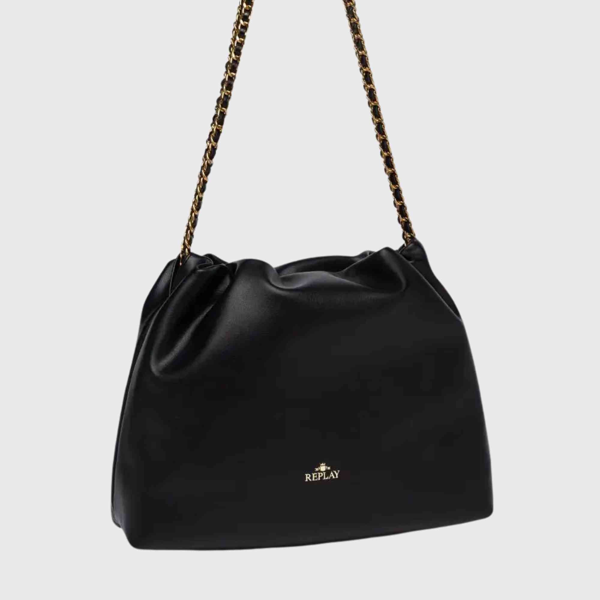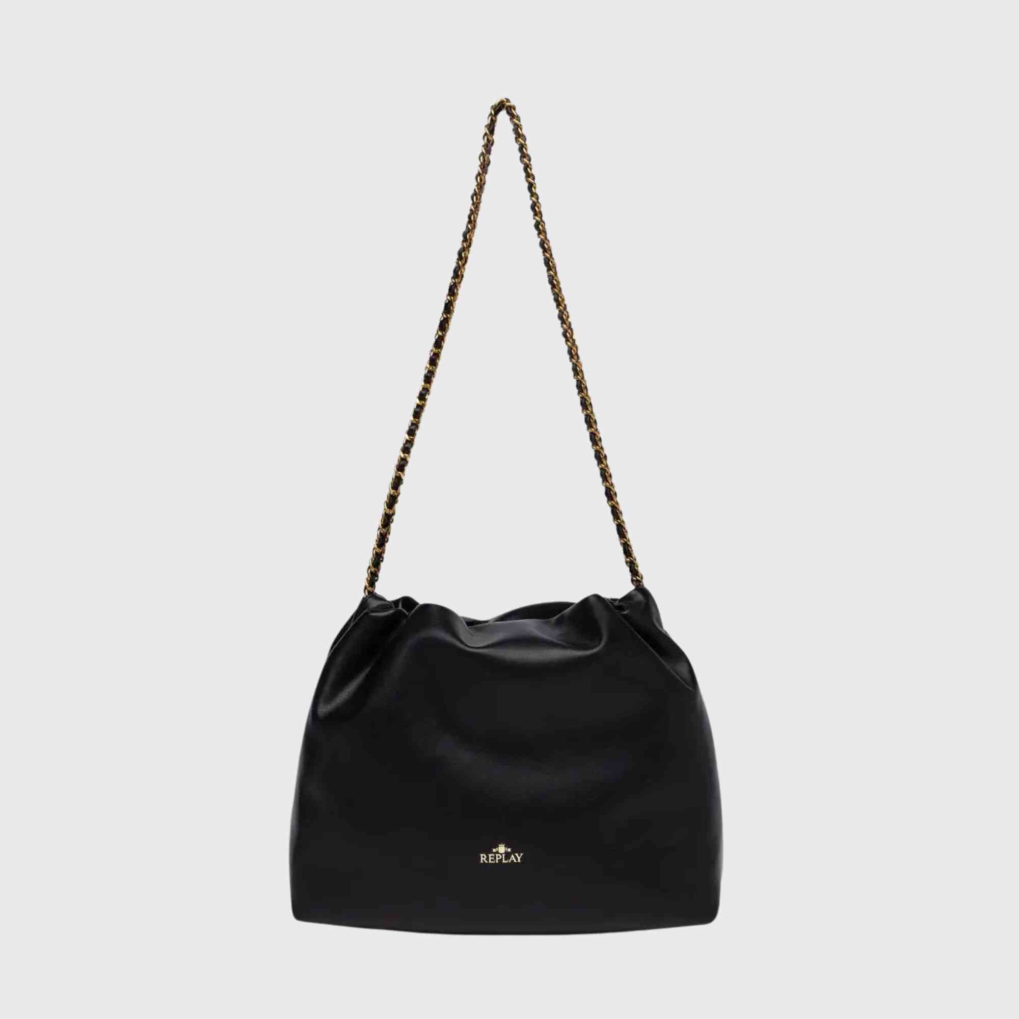Unifarbene Tasche, weich im Griff, mit dünnem Kettenriemen, verflochten mit passendem Material. Das Modell ist oben leicht gerafft und mit dem Replay-Schriftzug und dem Archiv-Logo auf der Vorderseite verziert.