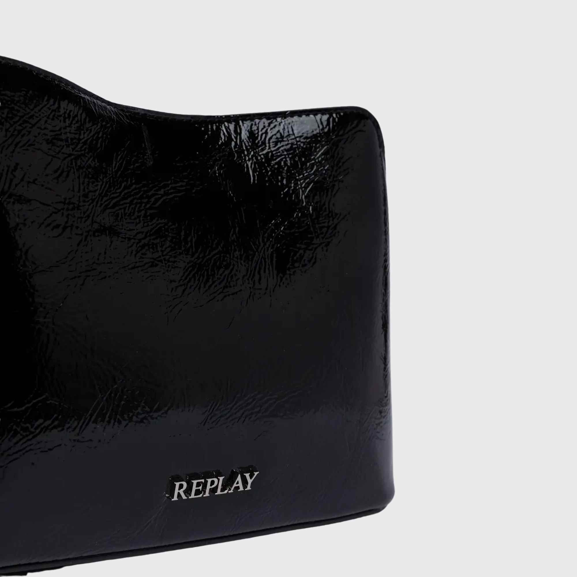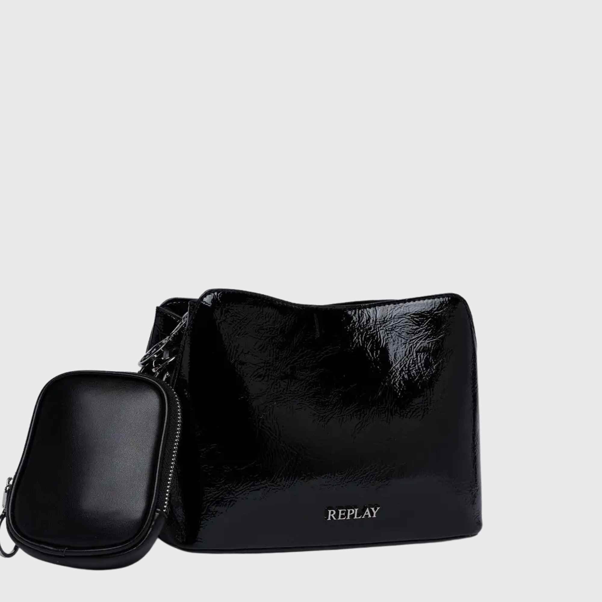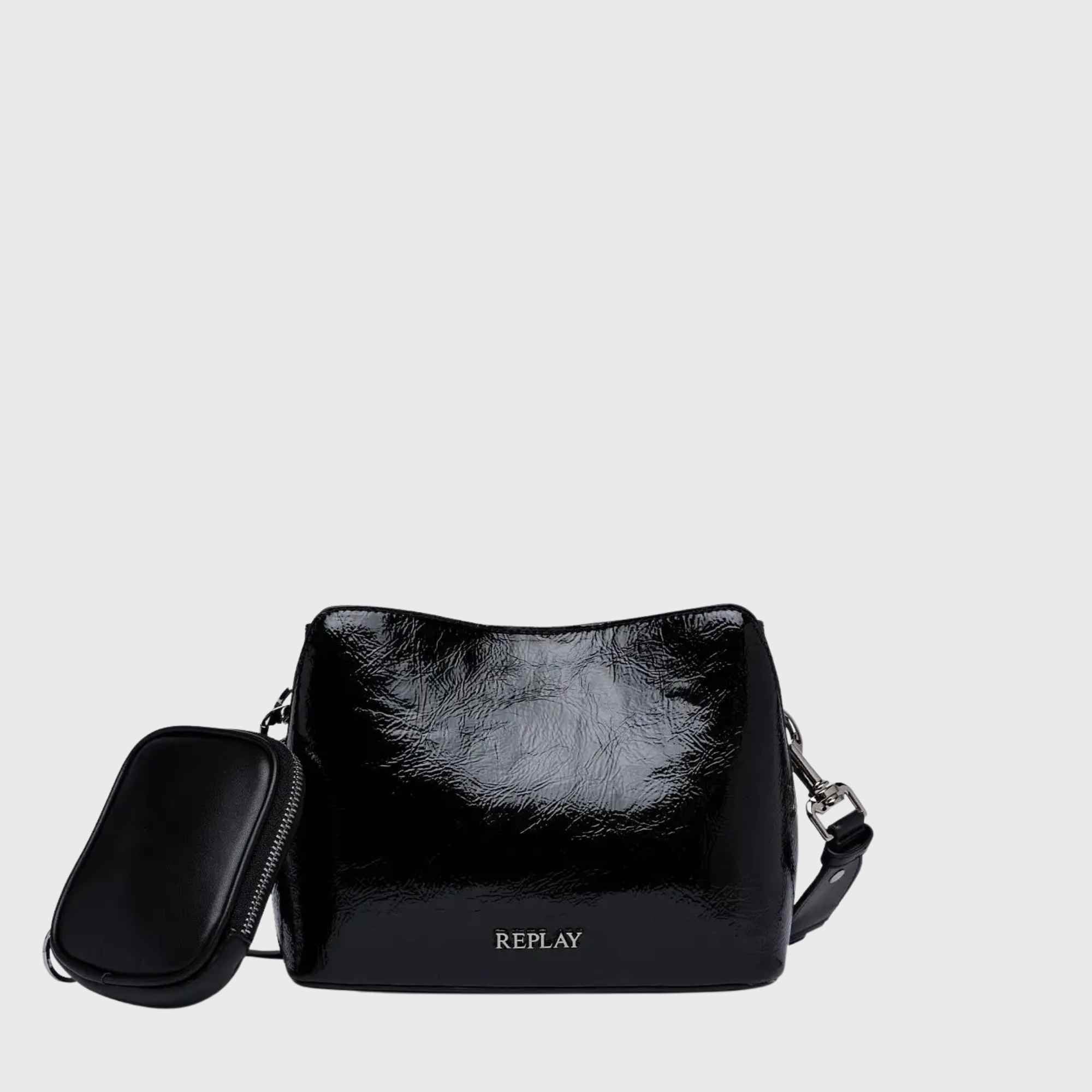 Unifarbene Mini-Tasche aus weichem, recyceltem PU in Lackoptik, einem nachhaltigen Material für eine umweltfreundliche Wahl. Das Modell mit Reißverschluss hat einen praktischen, passenden, durch Karabinerhaken abnehmbaren Schultergurt und einen passenden Geldbeutel mit Reißverschluss, der ebenfalls durch Karabinerhaken abnehmbar ist. Der Replay-Schriftzug in Reliefoptik auf der Vorderseite vervollständigt das Accessoire.