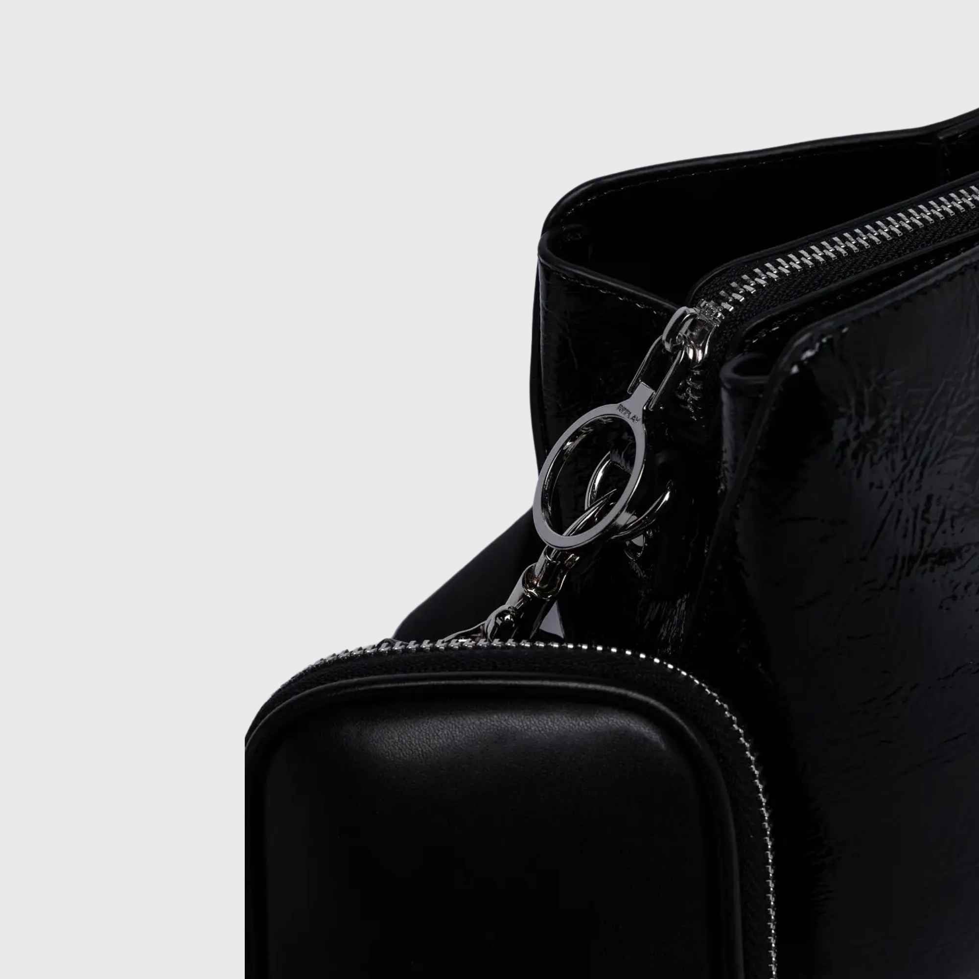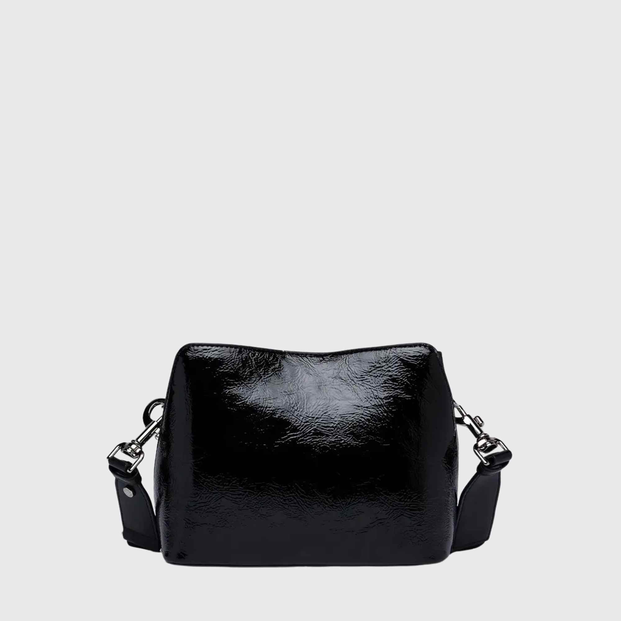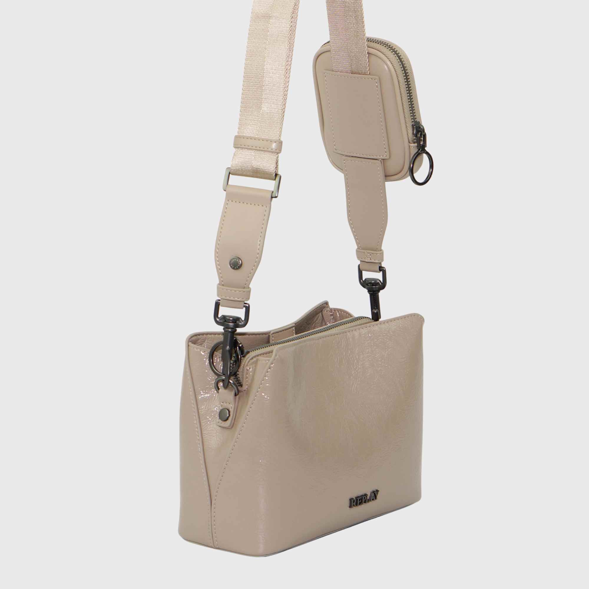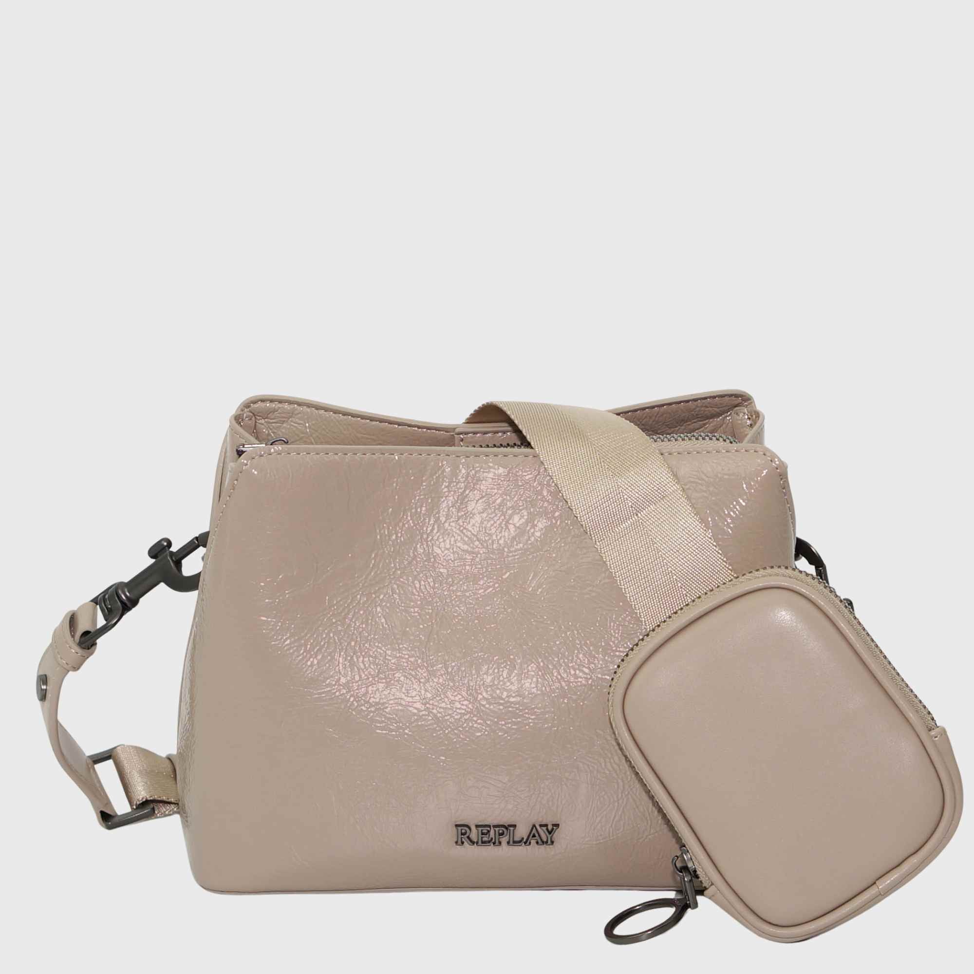 Unifarbene Mini-Tasche aus weichem, recyceltem PU in Lackoptik, einem nachhaltigen Material für eine umweltfreundliche Wahl. Das Modell mit Reißverschluss hat einen praktischen, passenden, durch Karabinerhaken abnehmbaren Schultergurt und einen passenden Geldbeutel mit Reißverschluss, der ebenfalls durch Karabinerhaken abnehmbar ist. Der Replay-Schriftzug in Reliefoptik auf der Vorderseite vervollständigt das Accessoire.