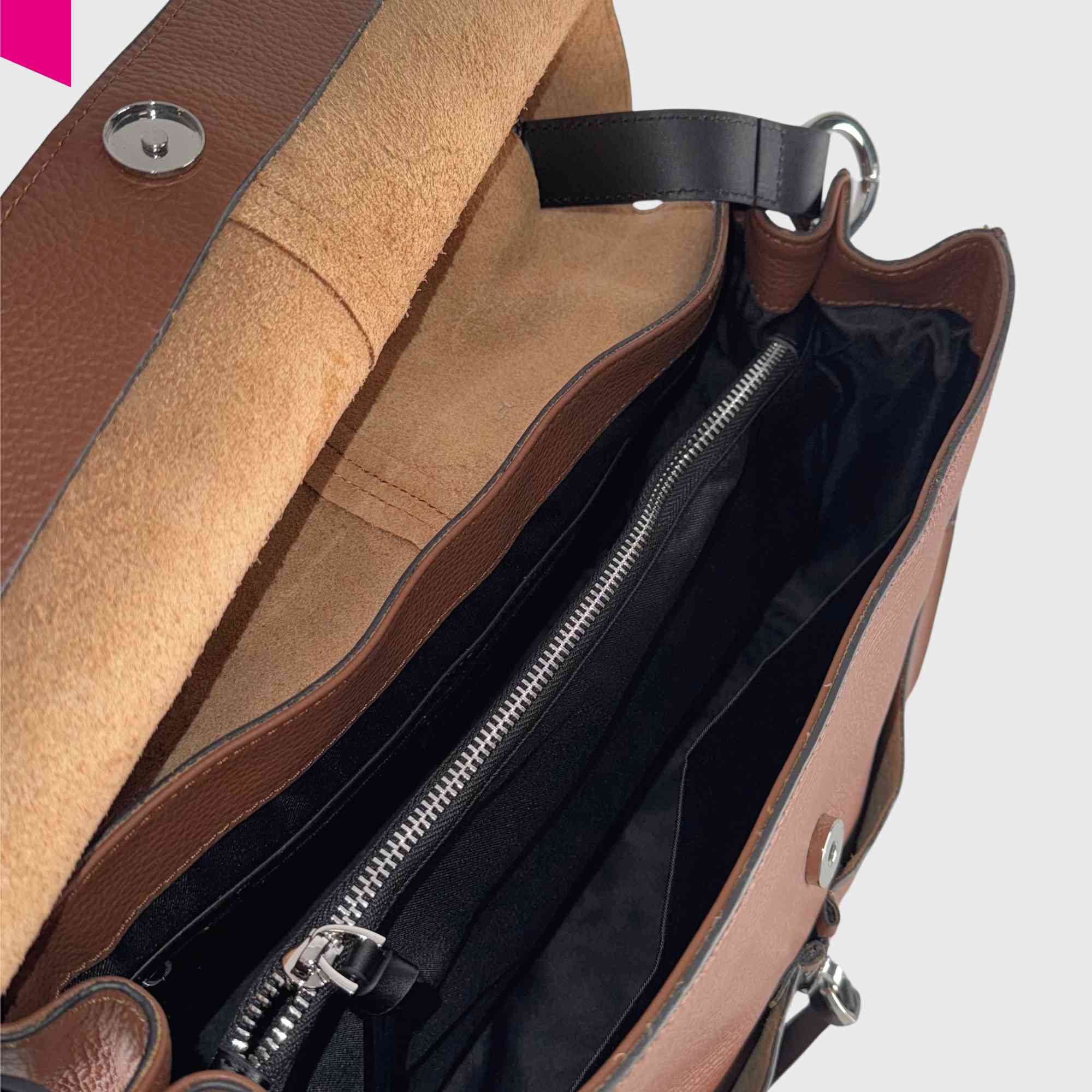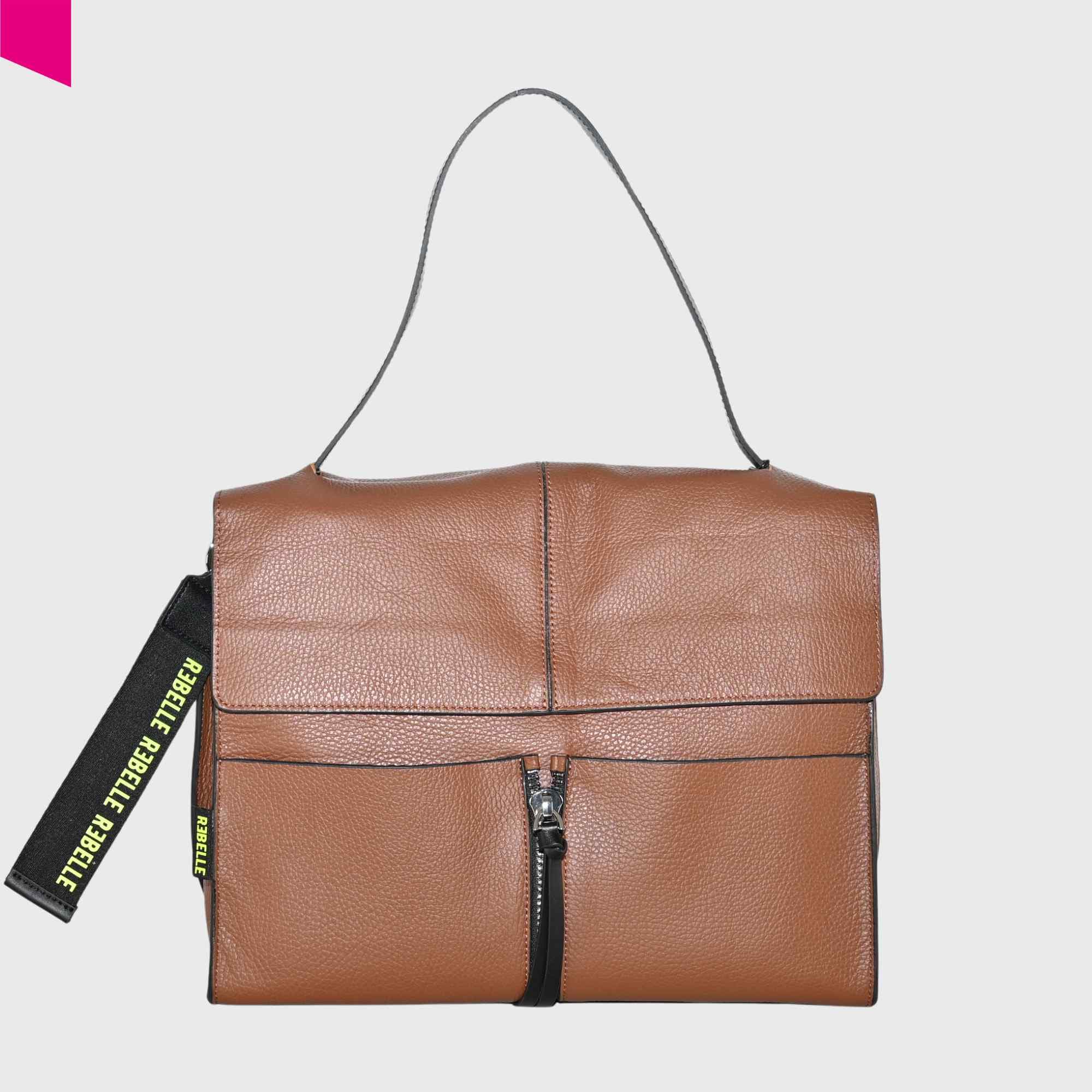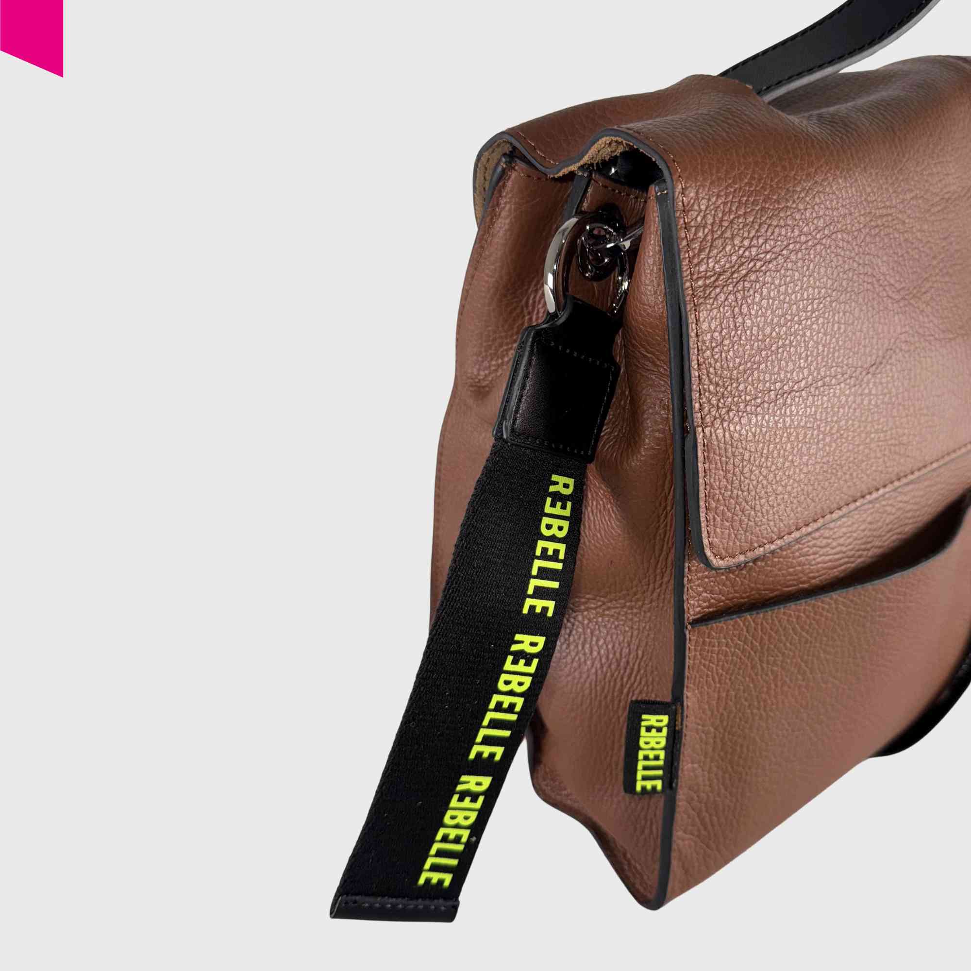 Dies ist CLIO, eine Schultertasche aus echtem, in Italien gefertigtem Leder. Sie gehört zur BASIC-Kollektion. CLIO ist das Must-Have der Rebelle-Kollektion, eine bequeme, praktische und modische Tasche. Sie zeichnet sich durch ihre doppelte Tragbarkeit aus: Man kann sie in der Hand tragen oder dank des abnehmbaren und verstellbaren Schulterriemens auch als Crossbody-Tasche verwenden. Das Innenleben ist gefüttert und in zwei sehr große Fächer unterteilt, die durch eine Reißverschlusstasche getrennt sind. Die Vorderseite der Tasche verfügt über zwei Einschubtaschen. Außen ist ein abnehmbarer Schlüsselanhänger mit dem Rebelle-Logo angebracht.