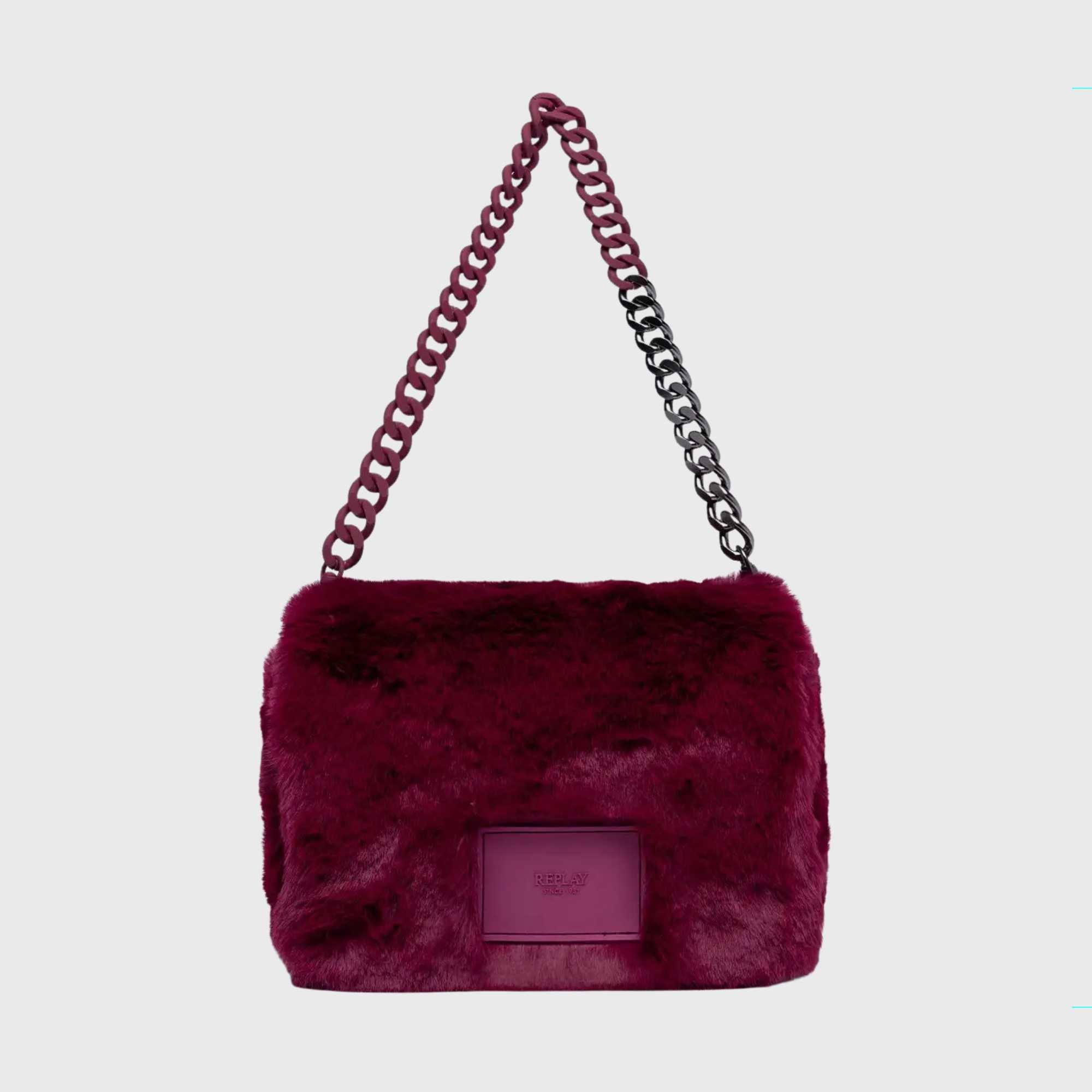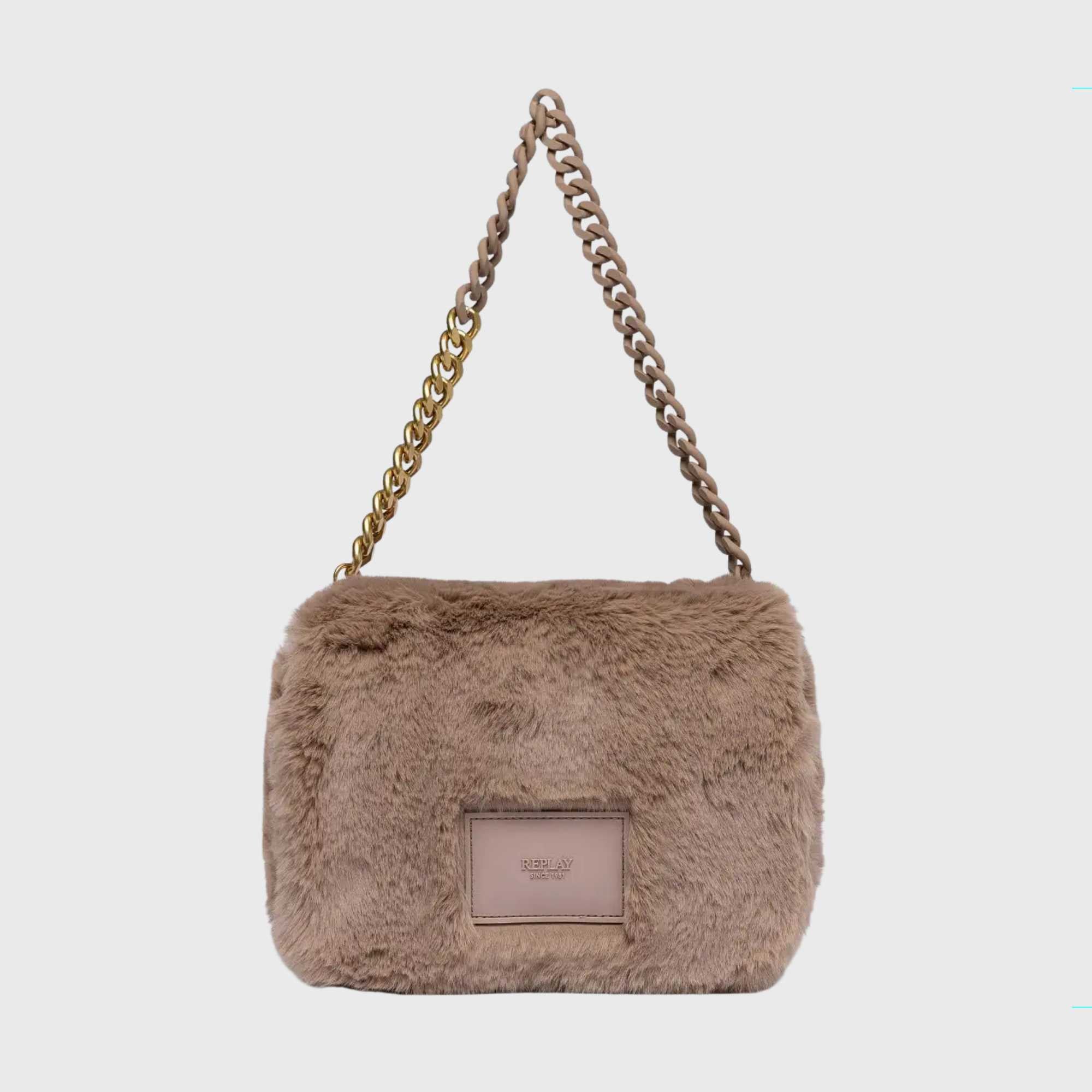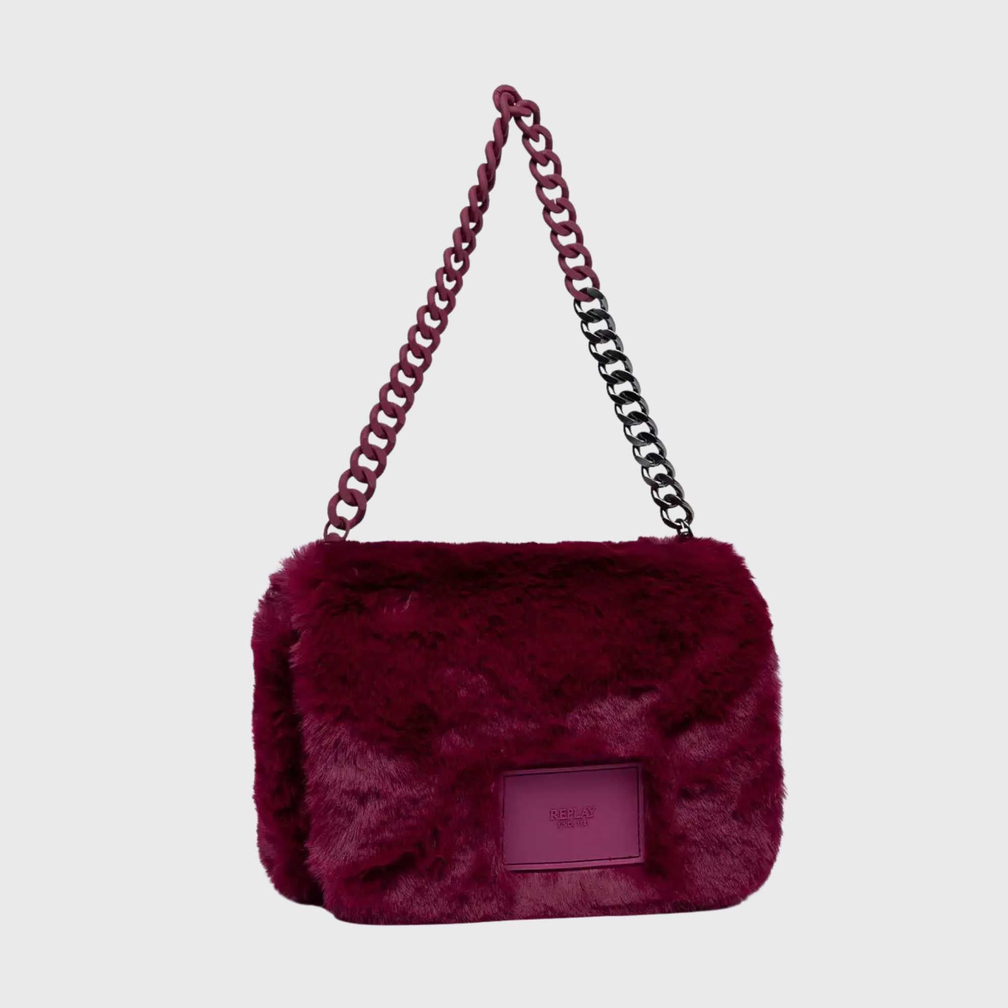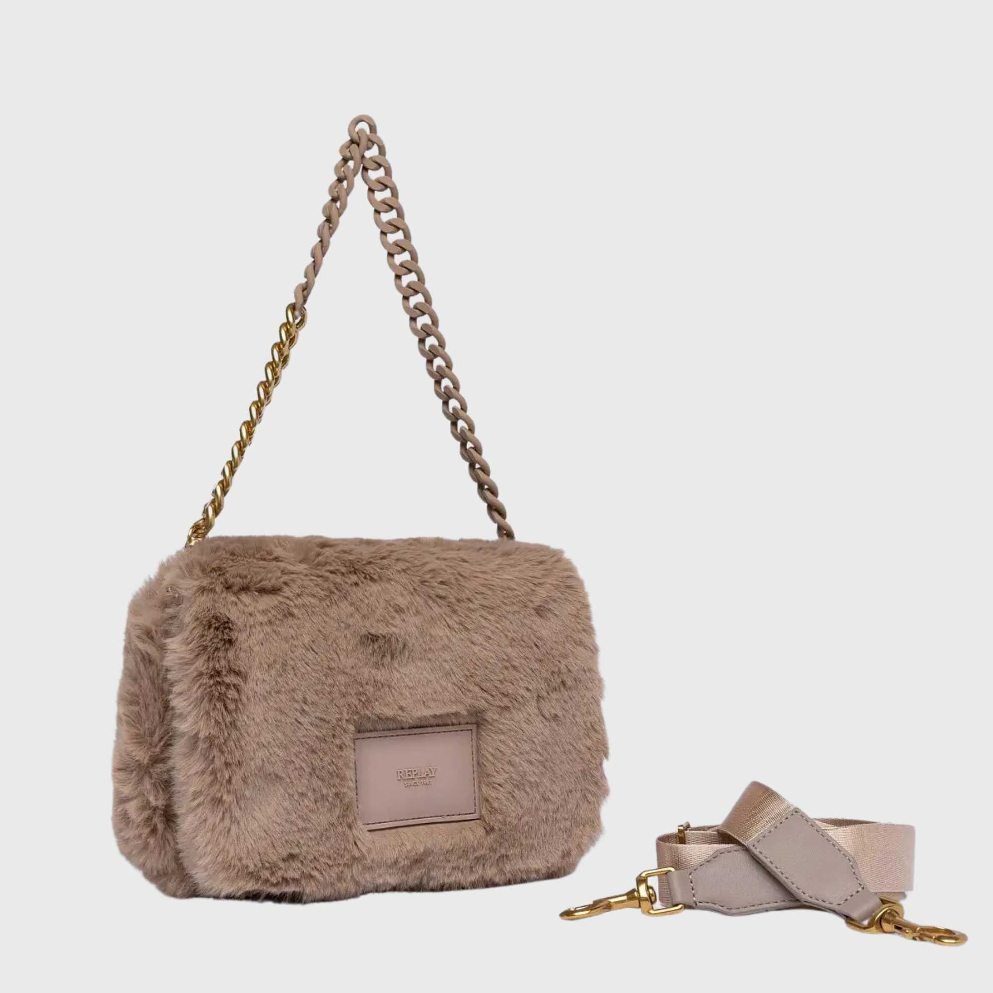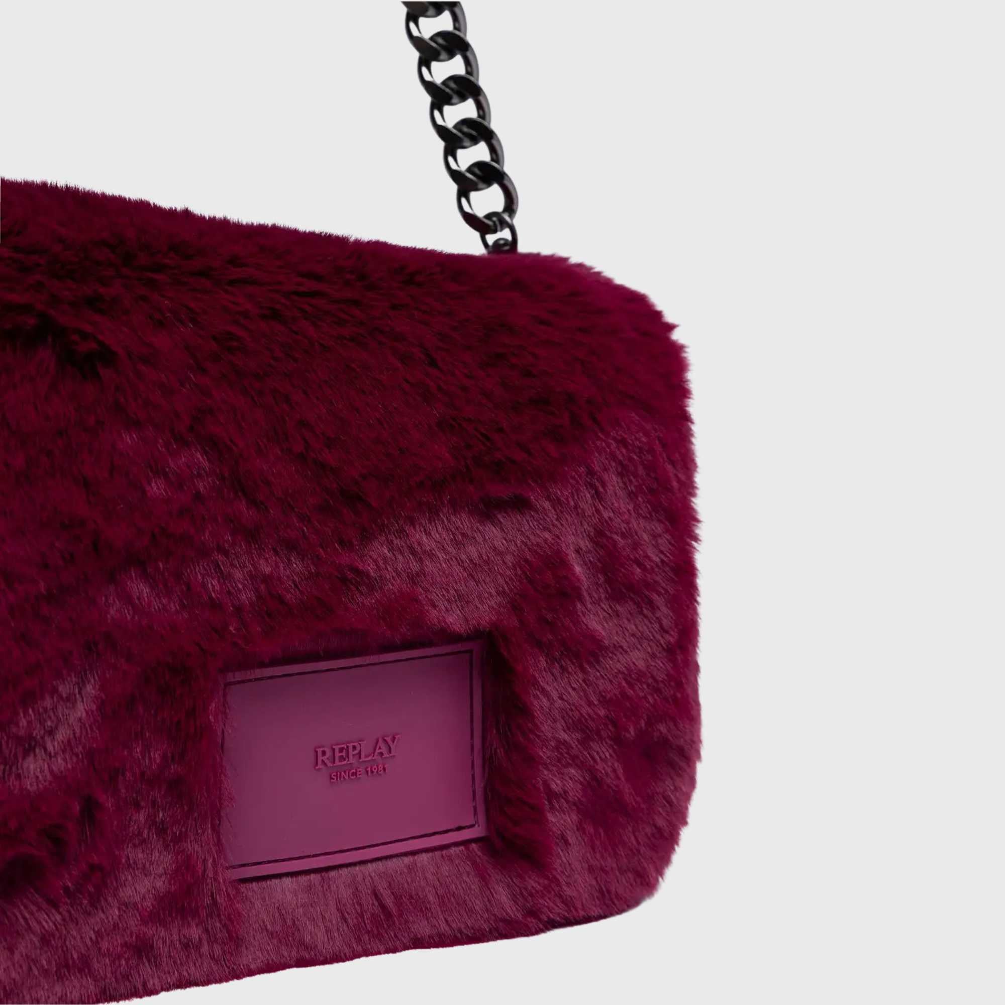 Unifarbene Mini-Tasche aus weichem Kunstfell mit Kettenhenkel oben und passendem, verstell- und abnehmbarem Schulterriemen mit Karabinerhaken. Das Accessoire hat einen Klappverschluss und ist mit einer Ton-in-Ton-Plakette mit Replay-Schriftzug auf der Vorderseiteversehen.