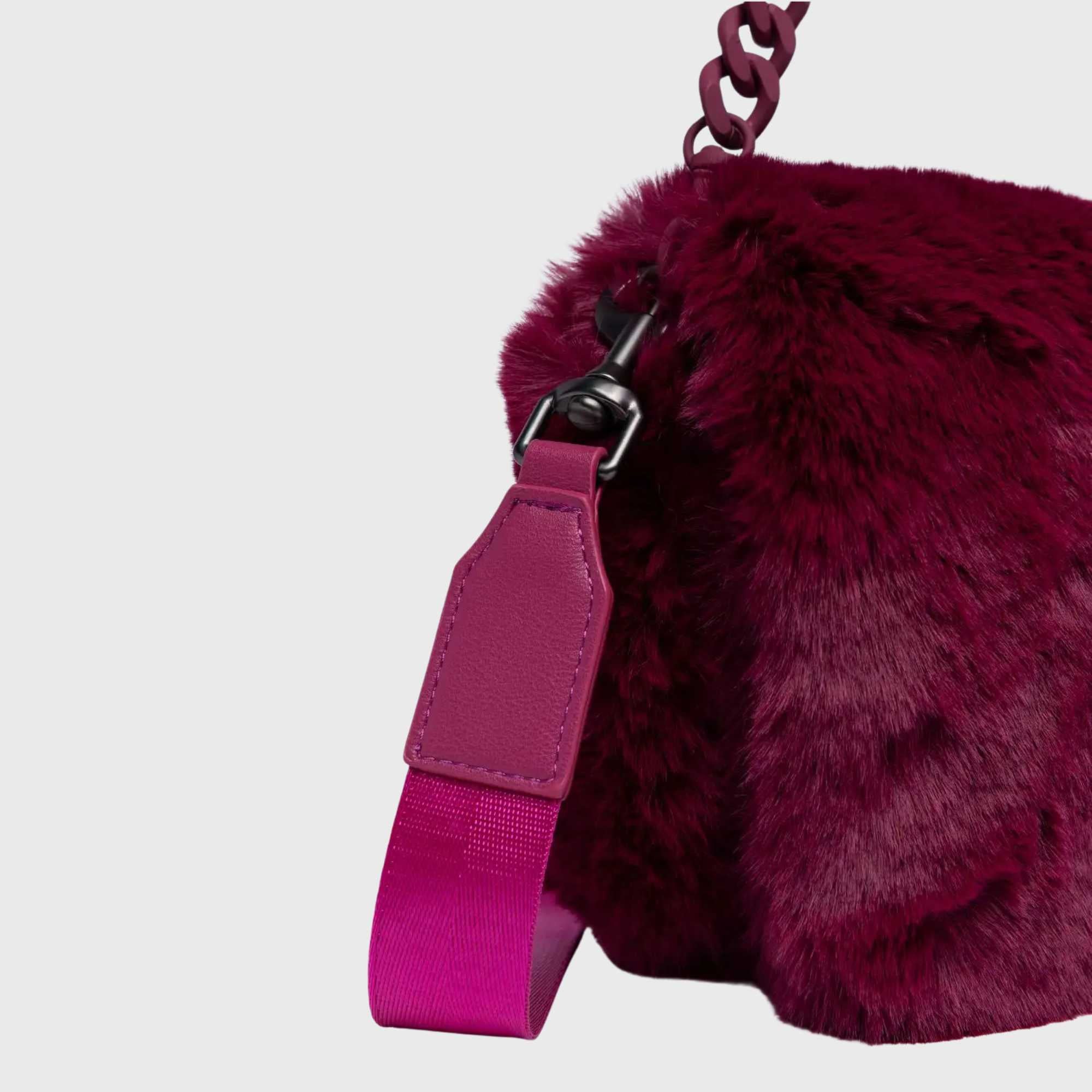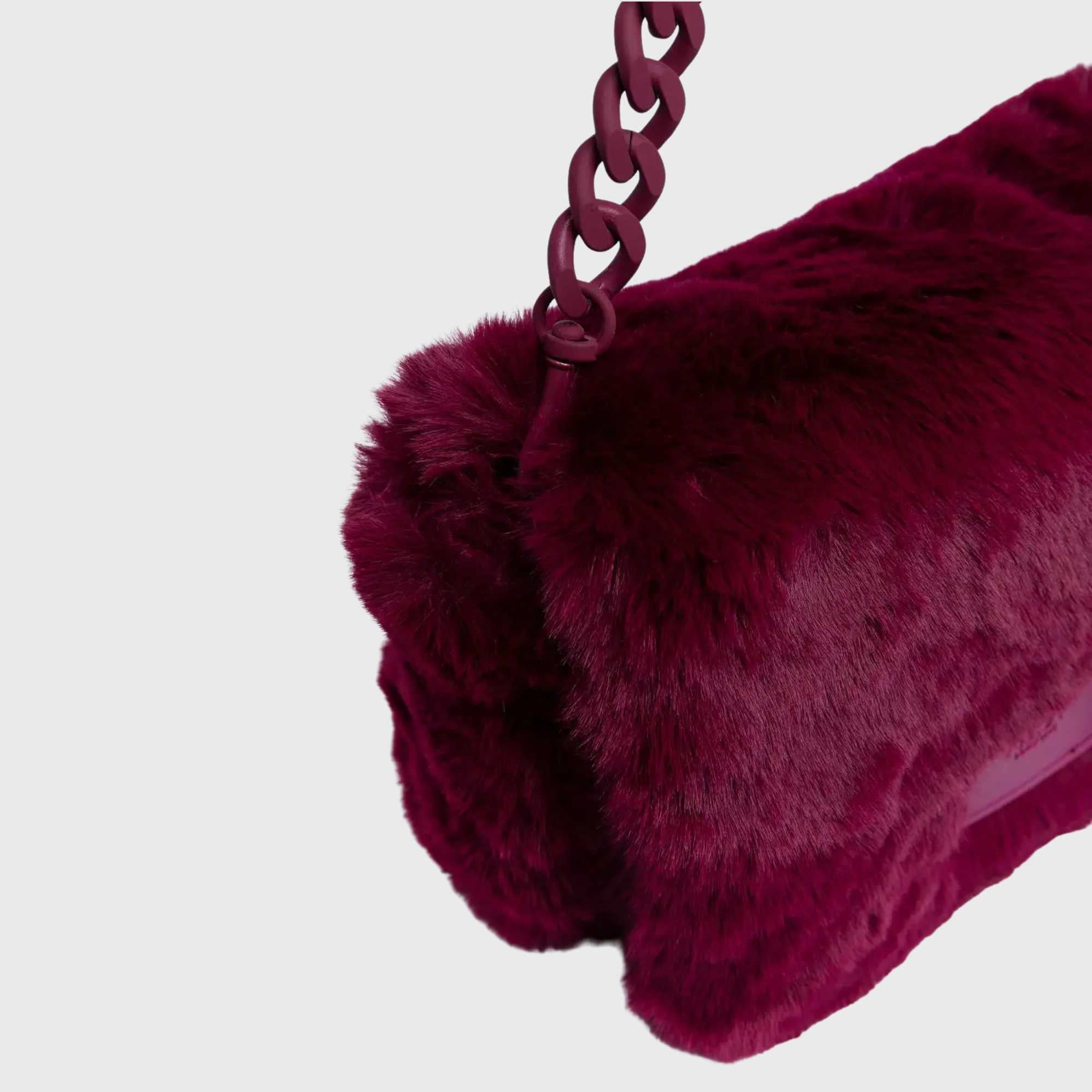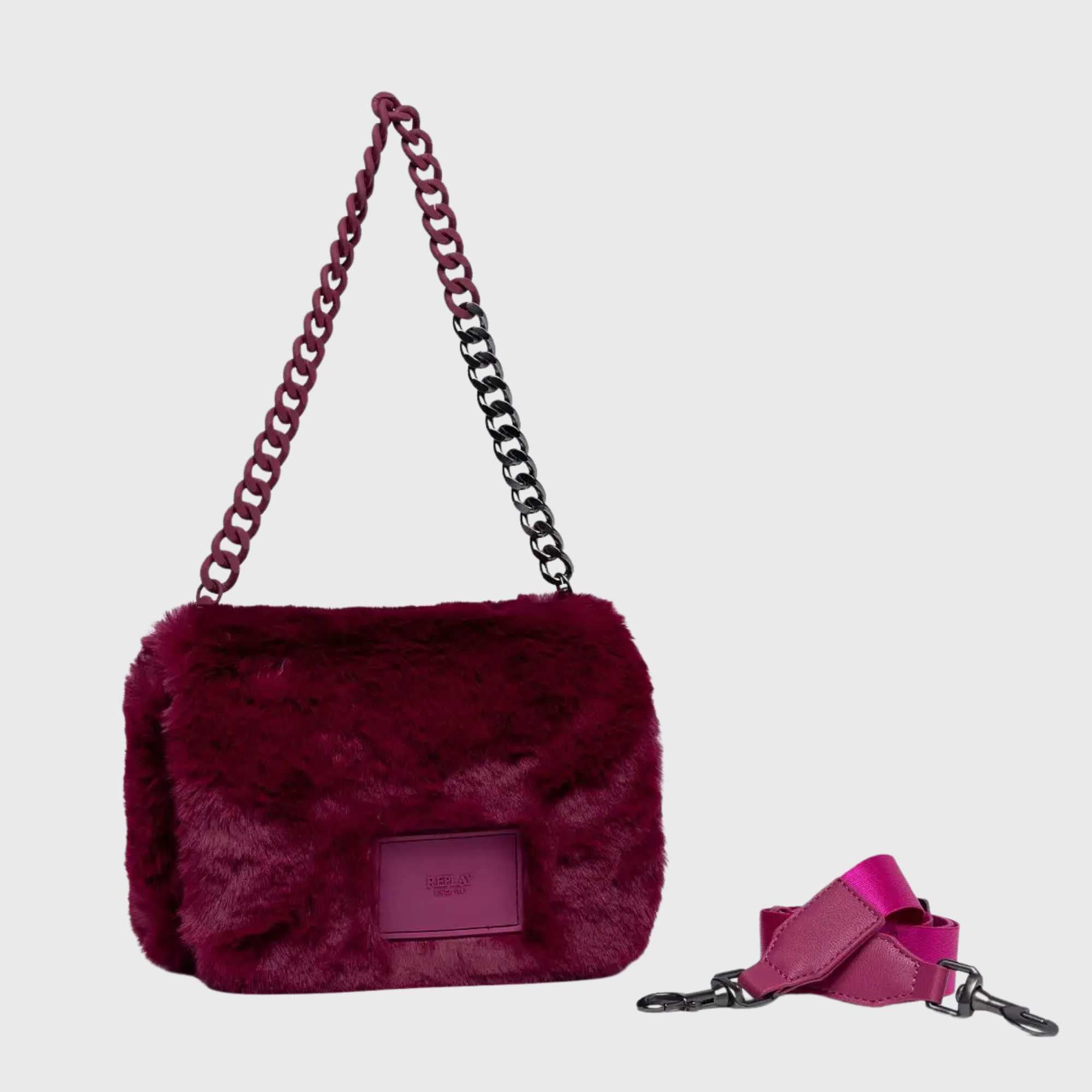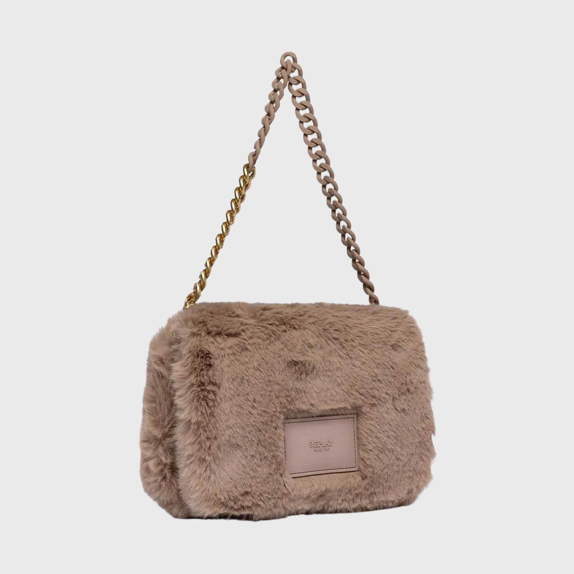Unifarbene Mini-Tasche aus weichem Kunstfell mit Kettenhenkel oben und passendem, verstell- und abnehmbarem Schulterriemen mit Karabinerhaken. Das Accessoire hat einen Klappverschluss und ist mit einer Ton-in-Ton-Plakette mit Replay-Schriftzug auf der Vorderseiteversehen.