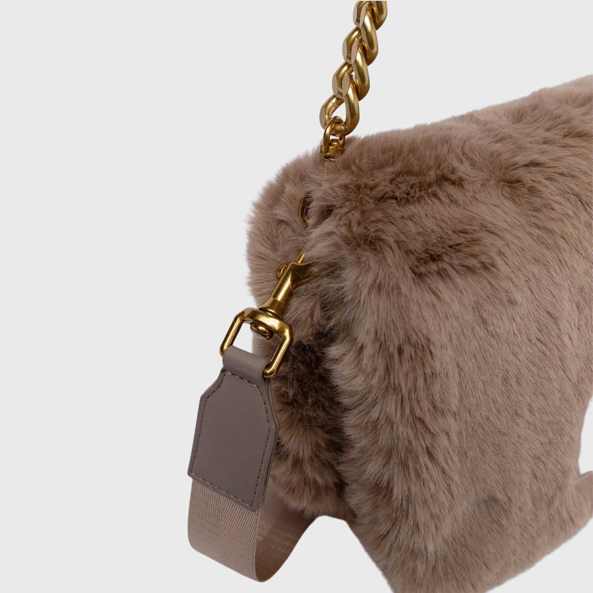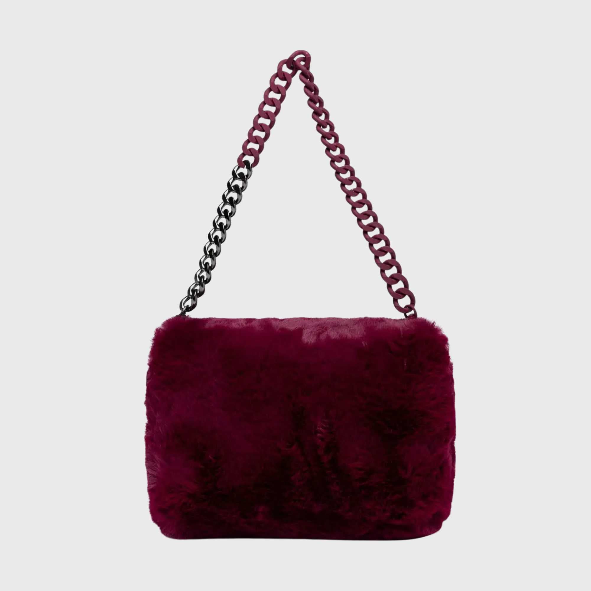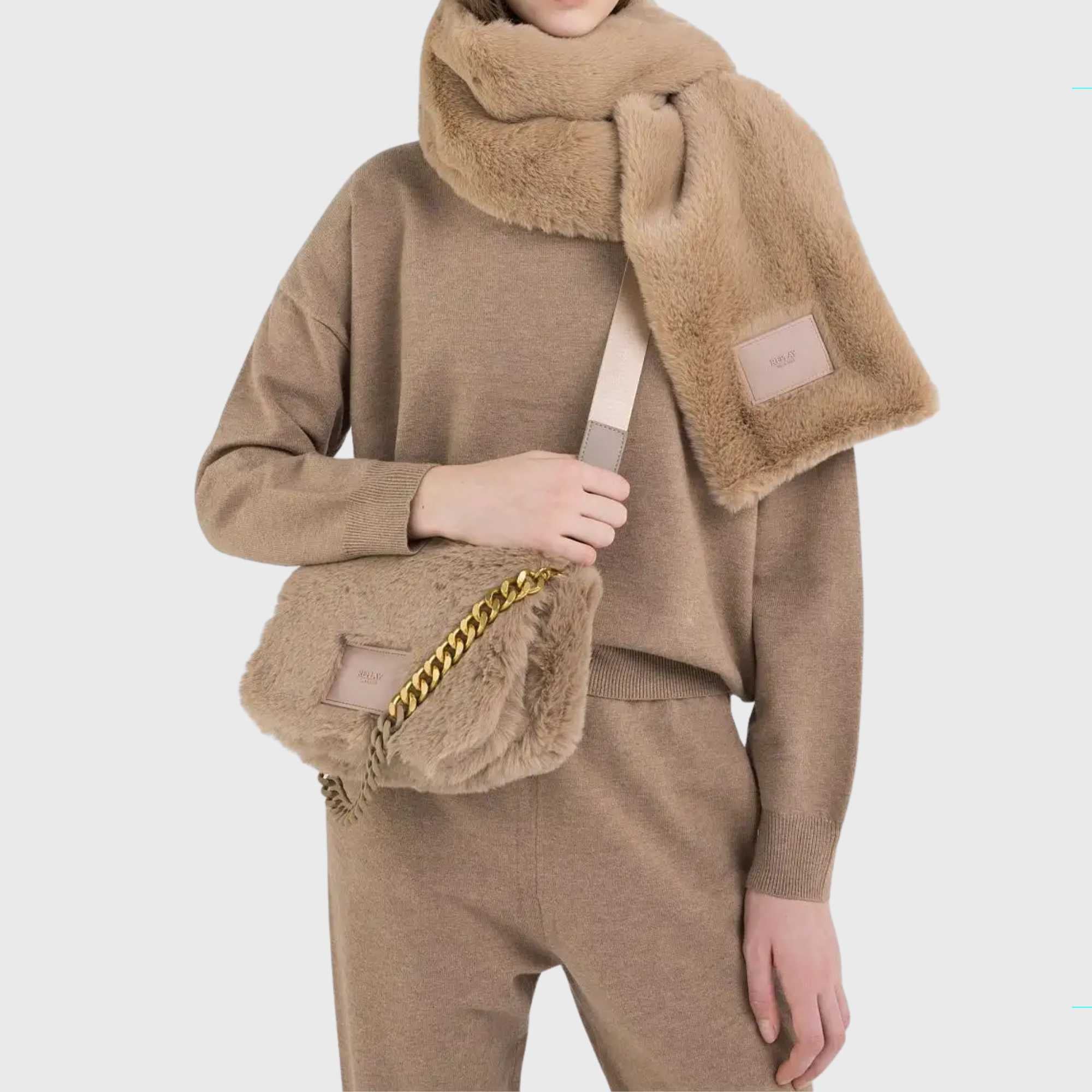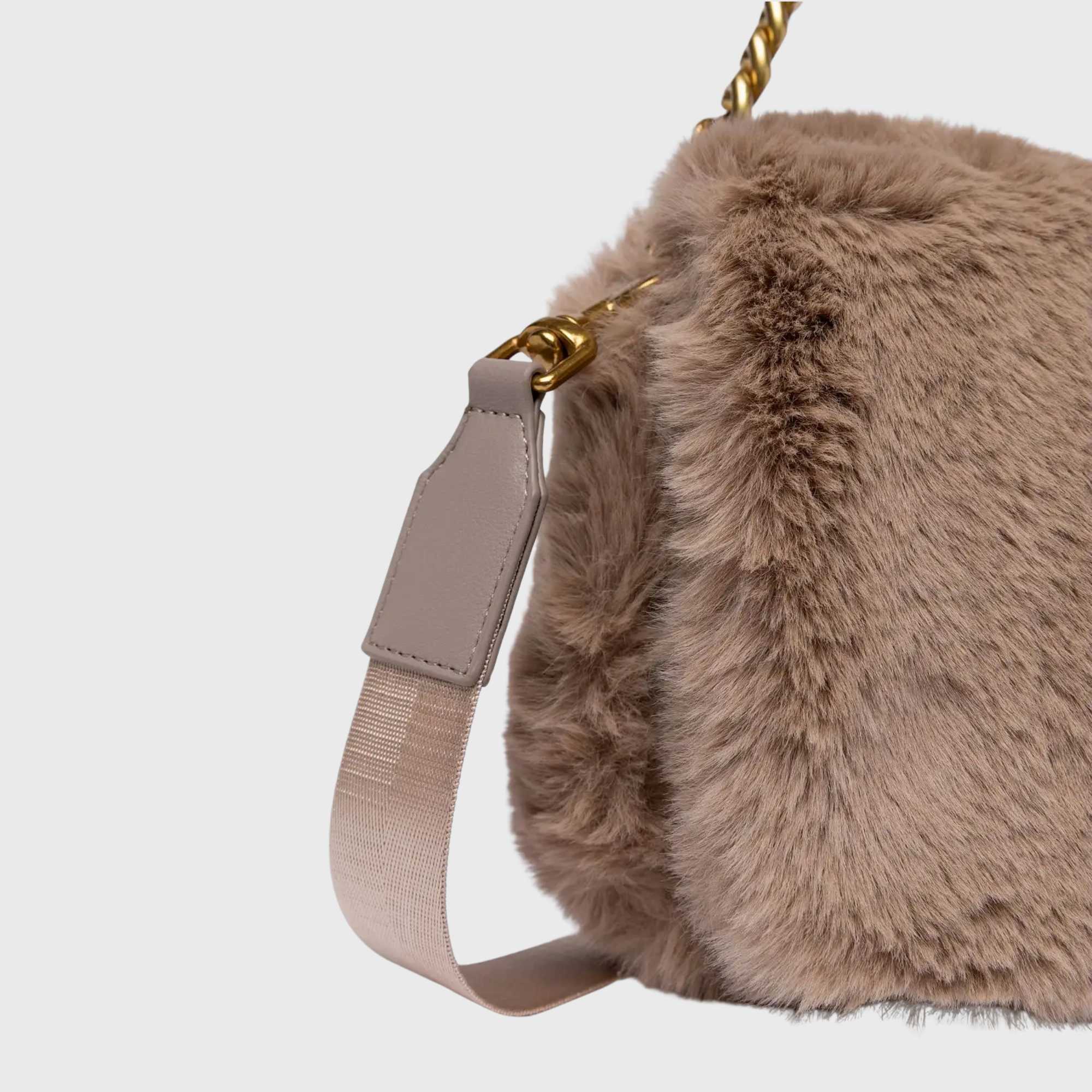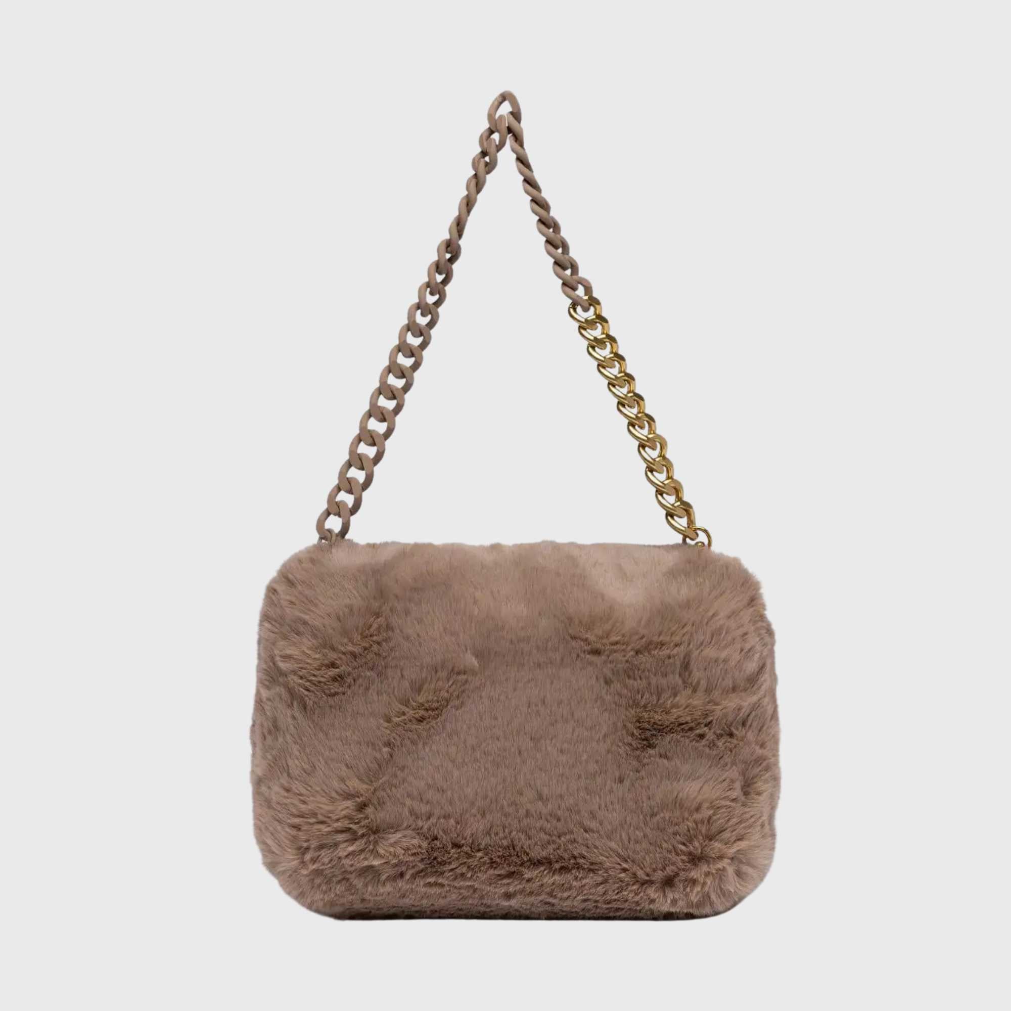 Unifarbene Mini-Tasche aus weichem Kunstfell mit Kettenhenkel oben und passendem, verstell- und abnehmbarem Schulterriemen mit Karabinerhaken. Das Accessoire hat einen Klappverschluss und ist mit einer Ton-in-Ton-Plakette mit Replay-Schriftzug auf der Vorderseiteversehen.