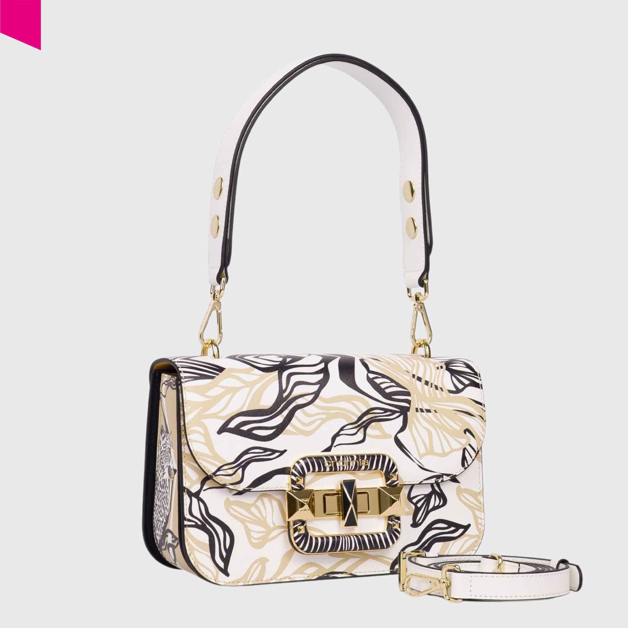 Die CROMIA Ladies Bag IT Leaf verfügt über einen verstellbaren Schulterriemen sowie einen zusätzlichen Crossbody-Riemen, wodurch verschiedene Tragevarianten möglich sind. Der Griff ist zusätzlich mit automatischen Druckknöpfen ausgestattet, die dem Design eine besondere Funktionalität verleihen.
