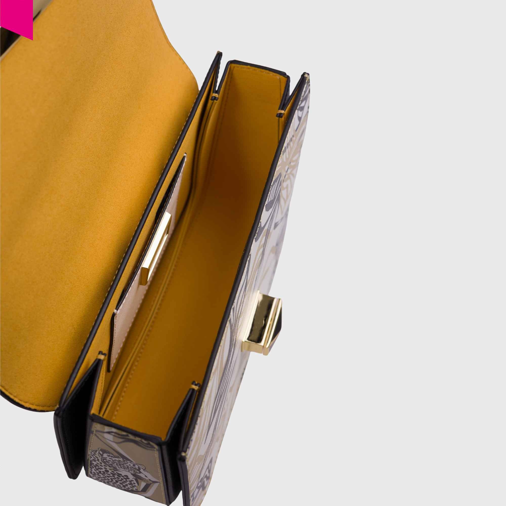 Gefertigt aus glattem, bedrucktem Kalbsleder (Vitello Liscio Stampato) überzeugt die CROMIA Ladies Bag IT Leaf durch ihr kunstvolles Jungle-Print-Design mit grafischen Blattmotiven. Die Kombination aus kontrastreichen Linien und natürlichen Formen verleiht dieser CROMIA Tasche eine besonders elegante und gleichzeitig moderne Ausstrahlung.
