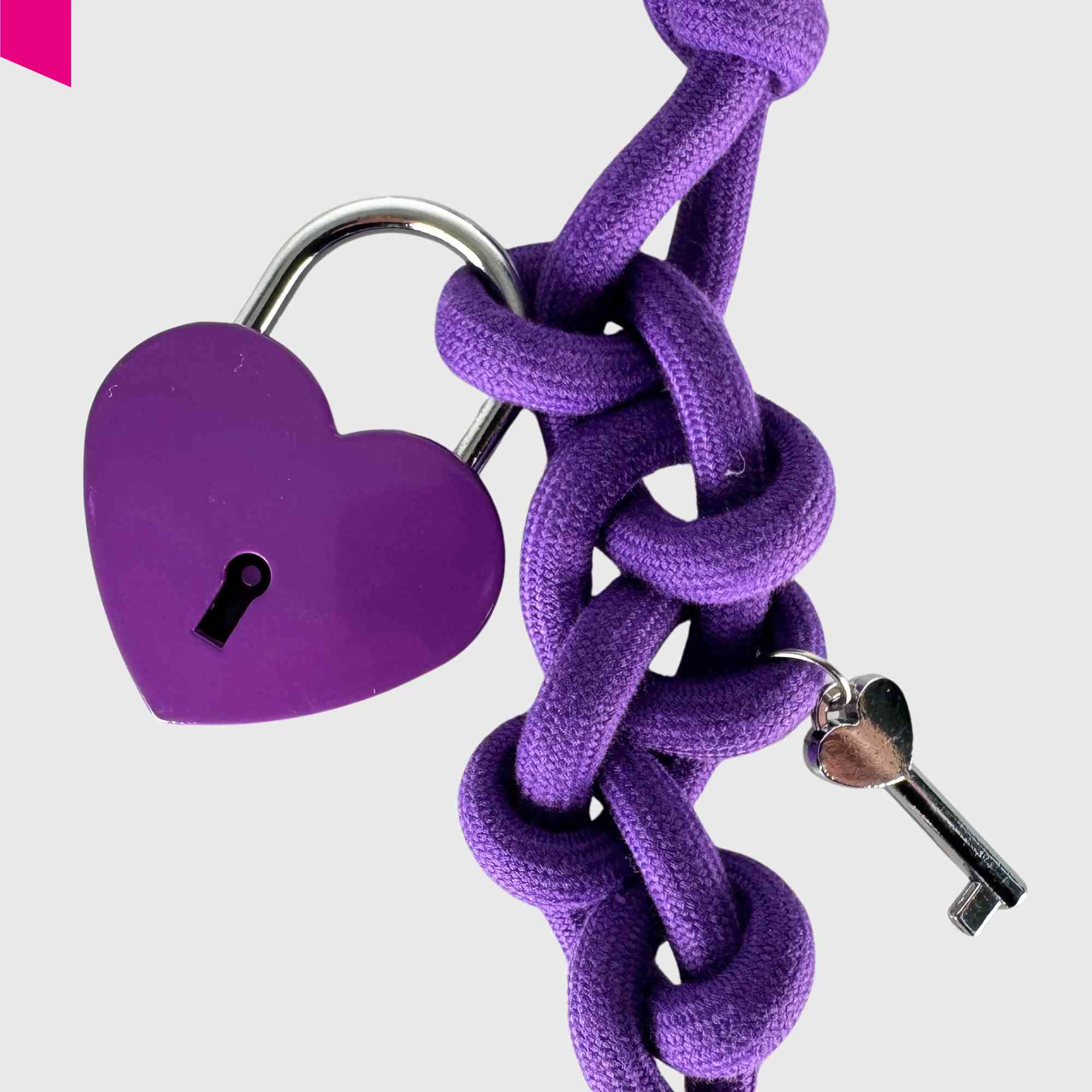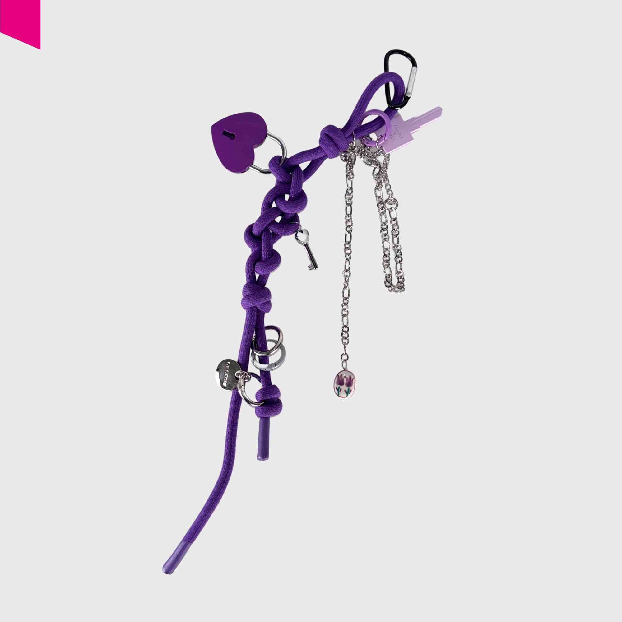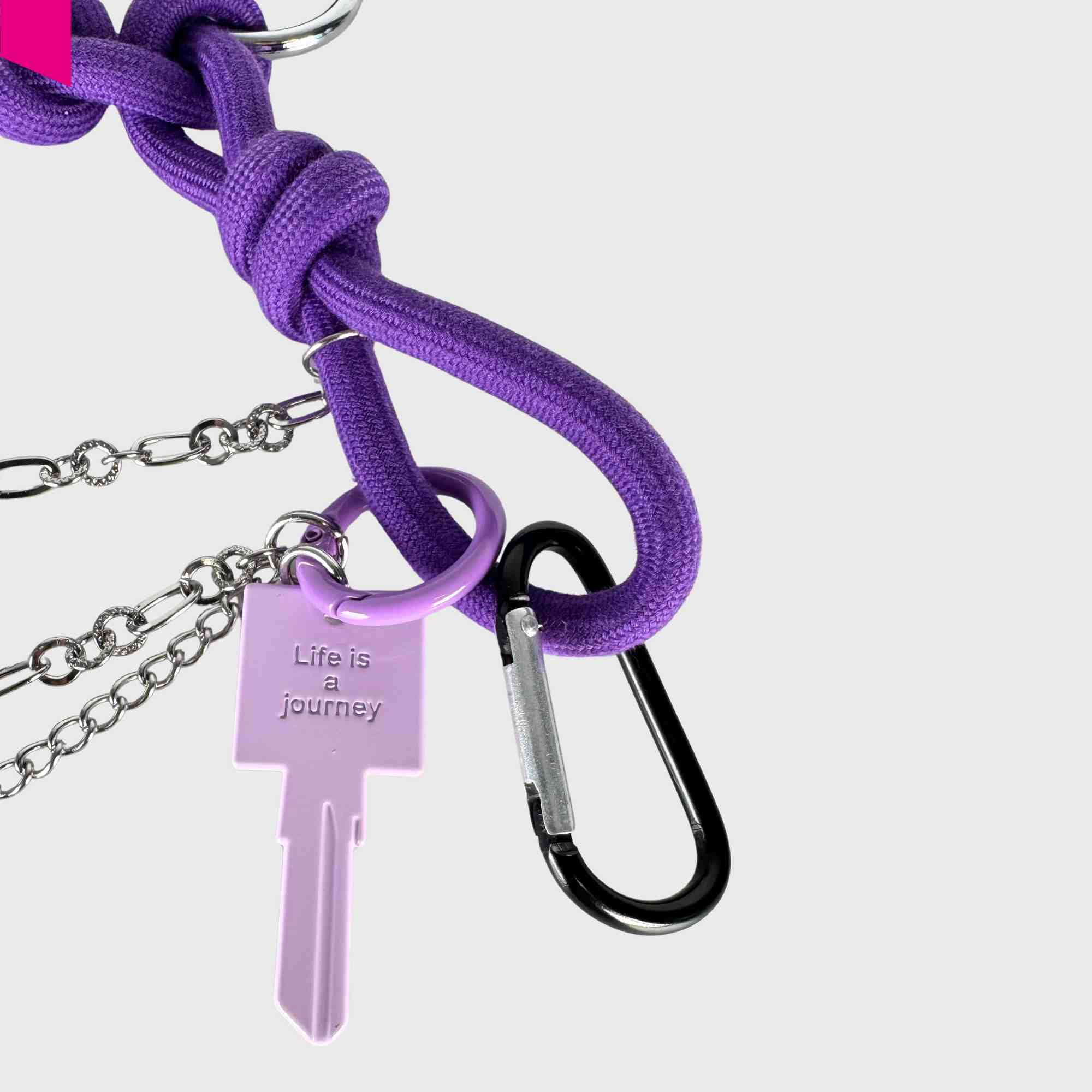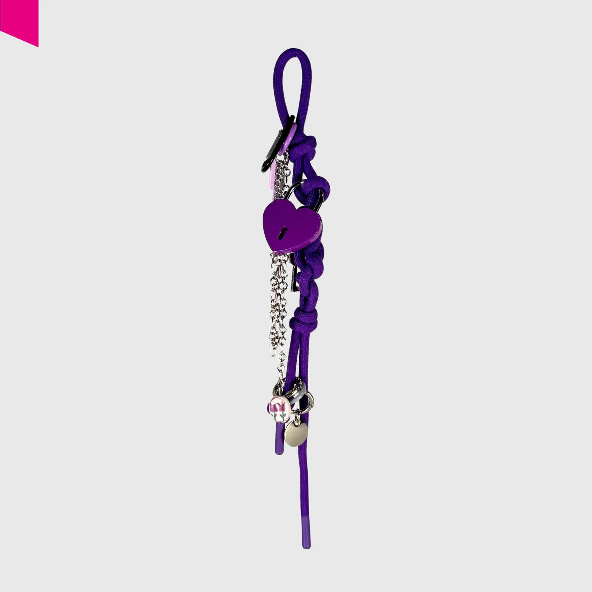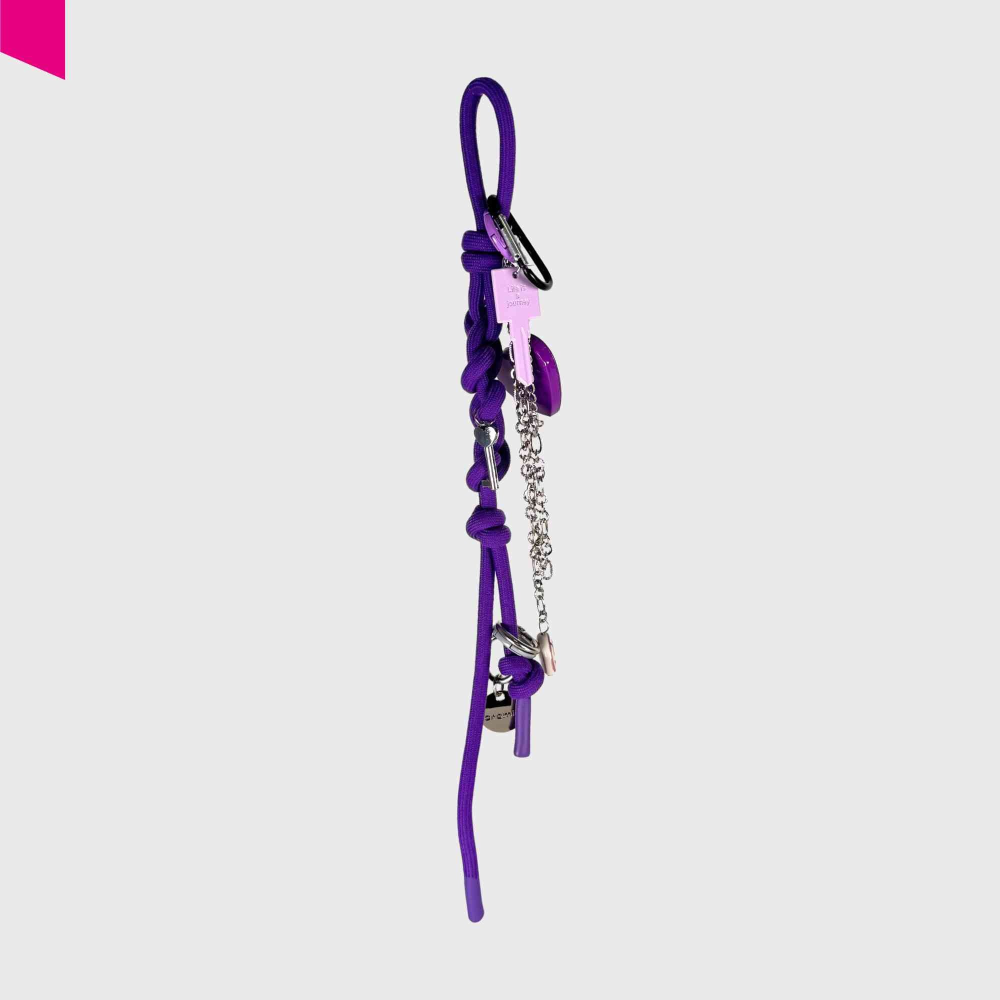 Der Love Anhänger von Cromia bringt Farbe, Symbolik und verspielte Details zusammen. Das geflochtene violette Textilband bildet die Basis für eine Reihe dekorativer Elemente: ein Herzschloss, mehrere Metallringe, kleine Schlüssel-Charms sowie eine feine Kette mit Anhänger. Der lilafarbene Schlüssel mit „Life is a journey“-Prägung verleiht dem Accessoire eine persönliche, positive Botschaft.