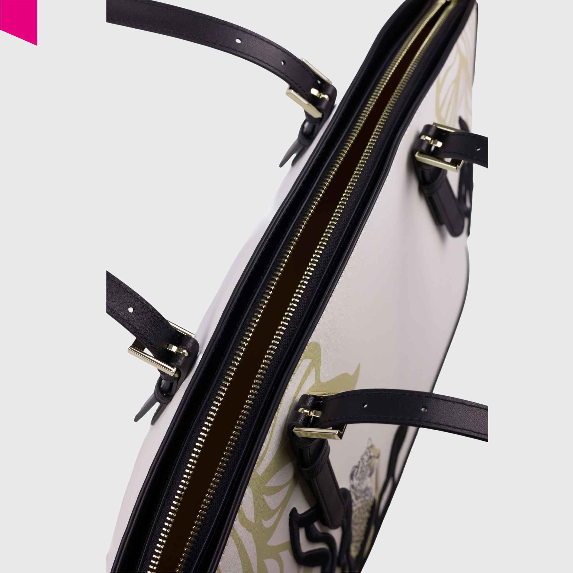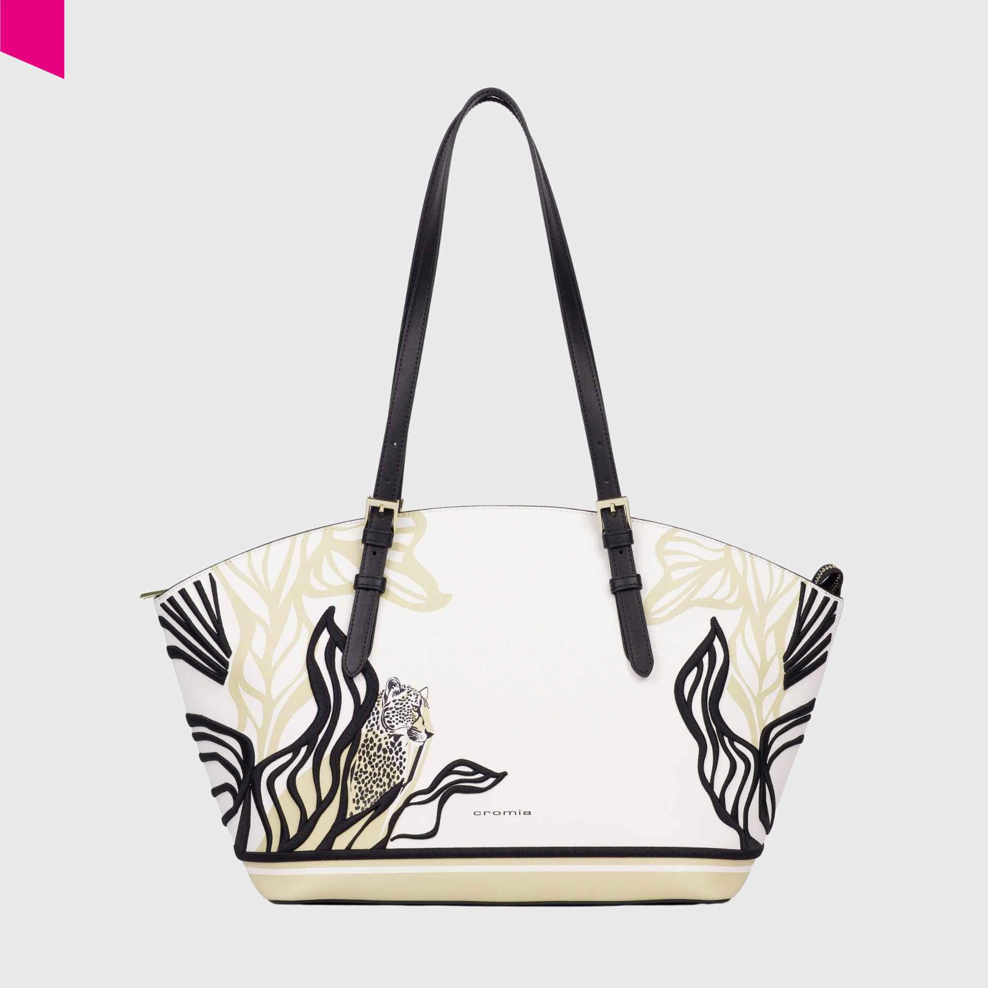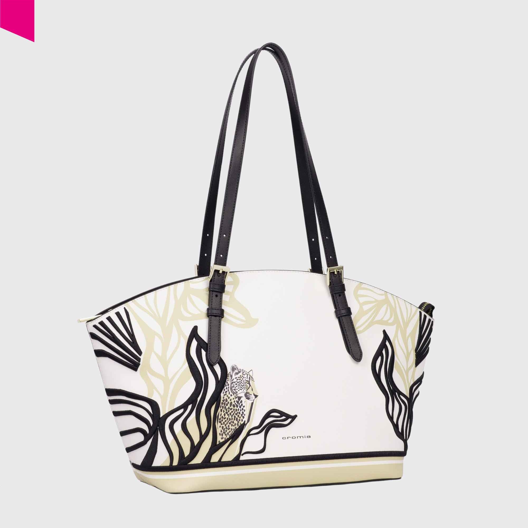 Die CROMIA Ladies Bag Metro Leaf ist eine großzügige Designer-Shopper-Tasche aus dem italienischen Modehaus CROMIA. Mit ihrem ausdrucksstarken Jungle-Print und den kunstvollen Stickereien vereint diese CROMIA Tasche modernes Design mit italienischer Lederhandwerkskunst.