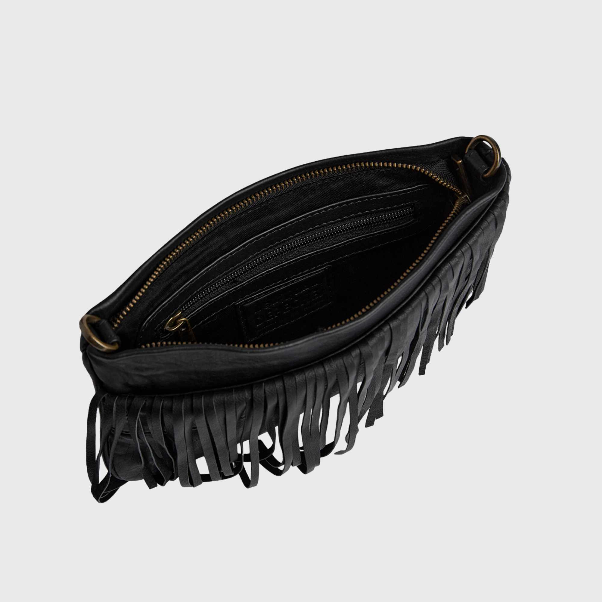 Das Design verfügt über einen abnehmbaren, verstellbaren Riemen, sodass du die Tasche vielseitig tragen kannst – crossbody, über der Schulter oder klassisch in der Hand. Ein cleveres Detail ermöglicht es zudem, die Hand hinter die Fransen zu schieben, um die Clutch ohne Riemen sicher zu halten.