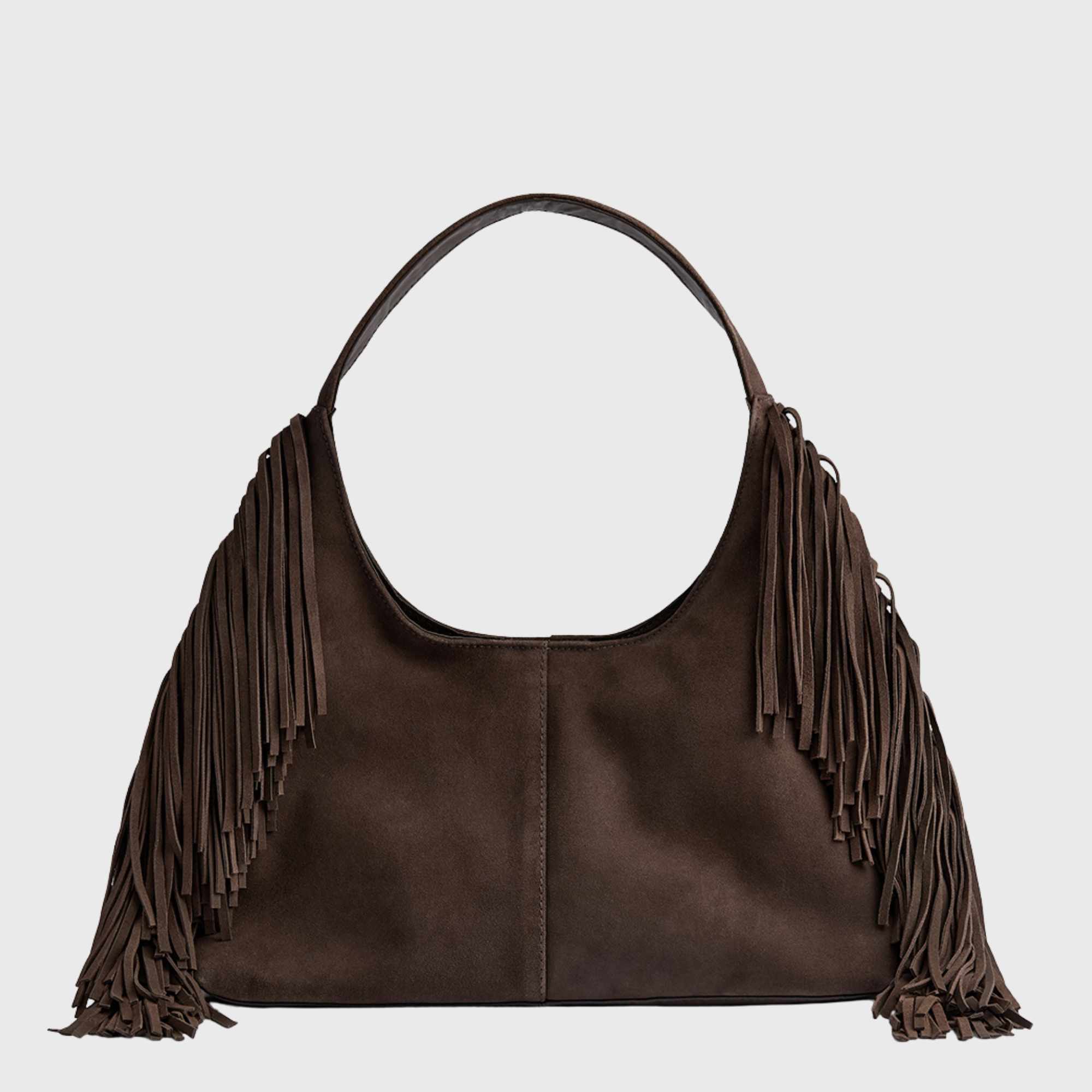 Diese wunderschöne Schultertasche aus Veloursleder ist ein stilvolles Statement-Piece. Mit ihrer weichen, matten Oberfläche und den markanten Fransen an beiden Seiten verleiht sie jedem Outfit einen trendigen und auffälligen Akzent. Die Fransen schwingen bei jedem Schritt elegant mit und bringen Leichtigkeit sowie Persönlichkeit in deinen Look – perfekt für alle, die eine Tasche mit Charakter und besonderer Ausstrahlung suchen.