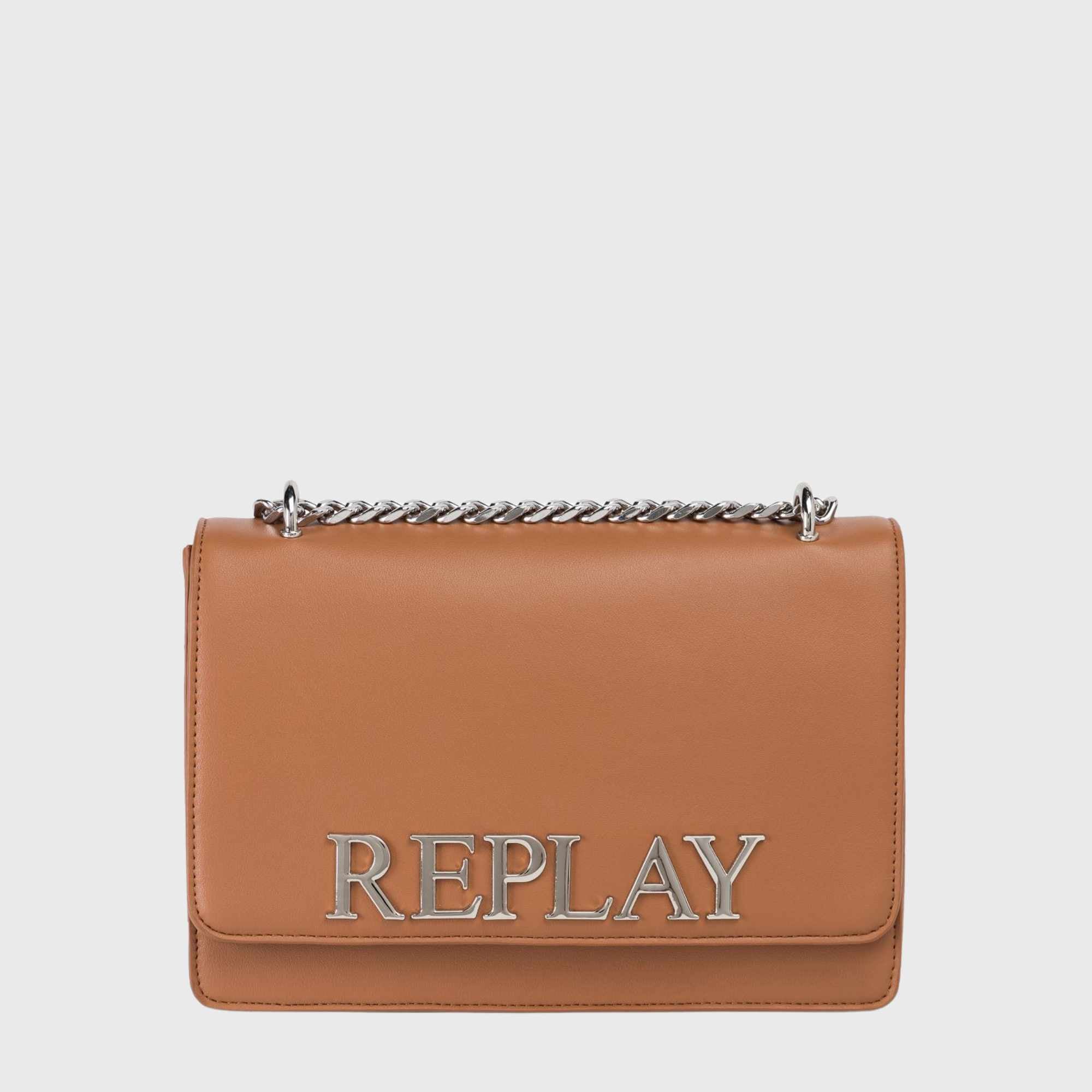 Einfarbige Tasche in gewalkter Optik mit Kettenschulterriemen mit passendem, verstellbarem, mit Sternen verziertem Schultergurt. Das Modell hat einen Überschlag mit Magnetknopf und einen Replay-Schriftzug aus Metall auf der Vorderseite.