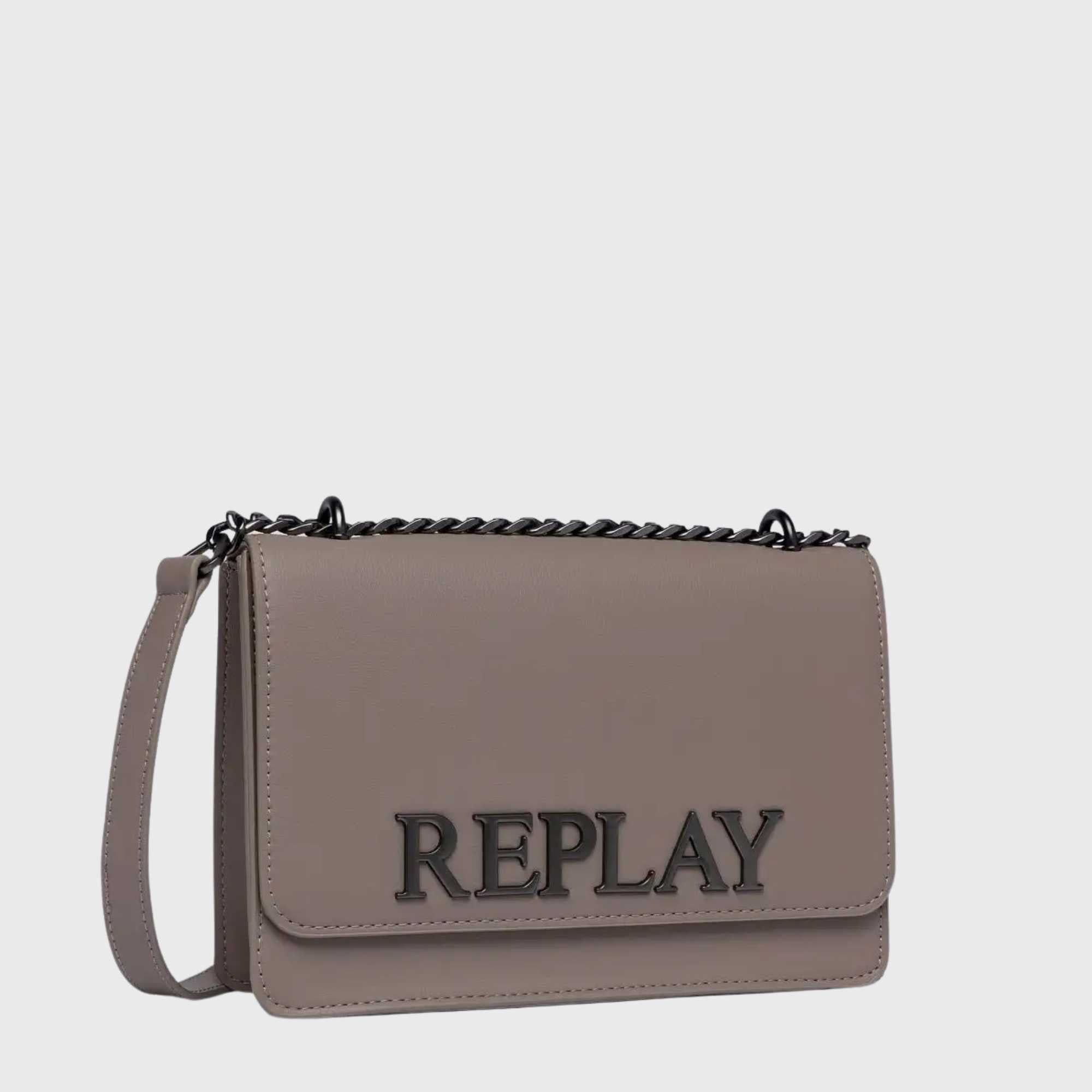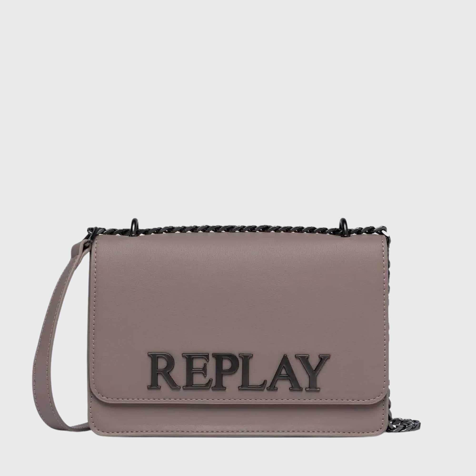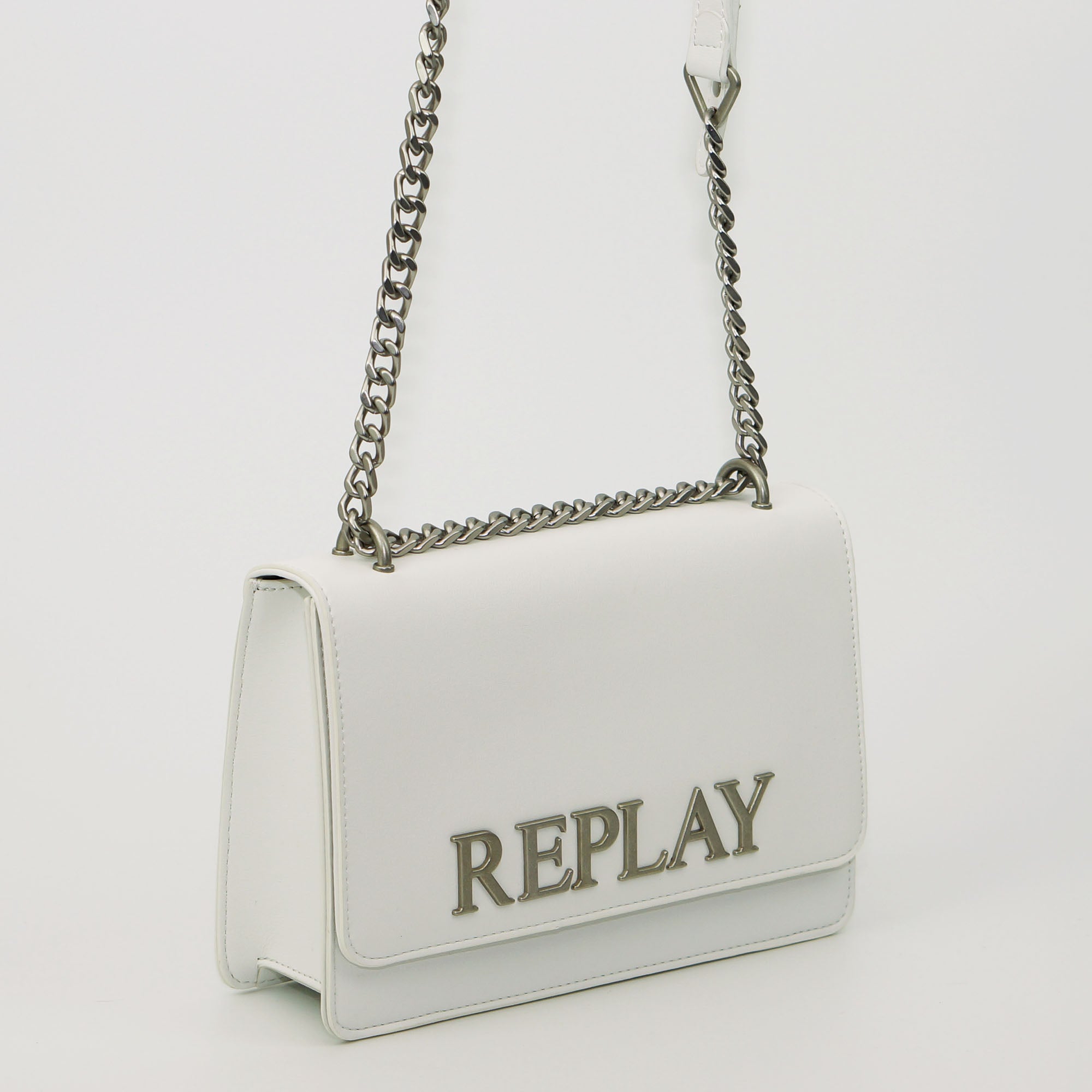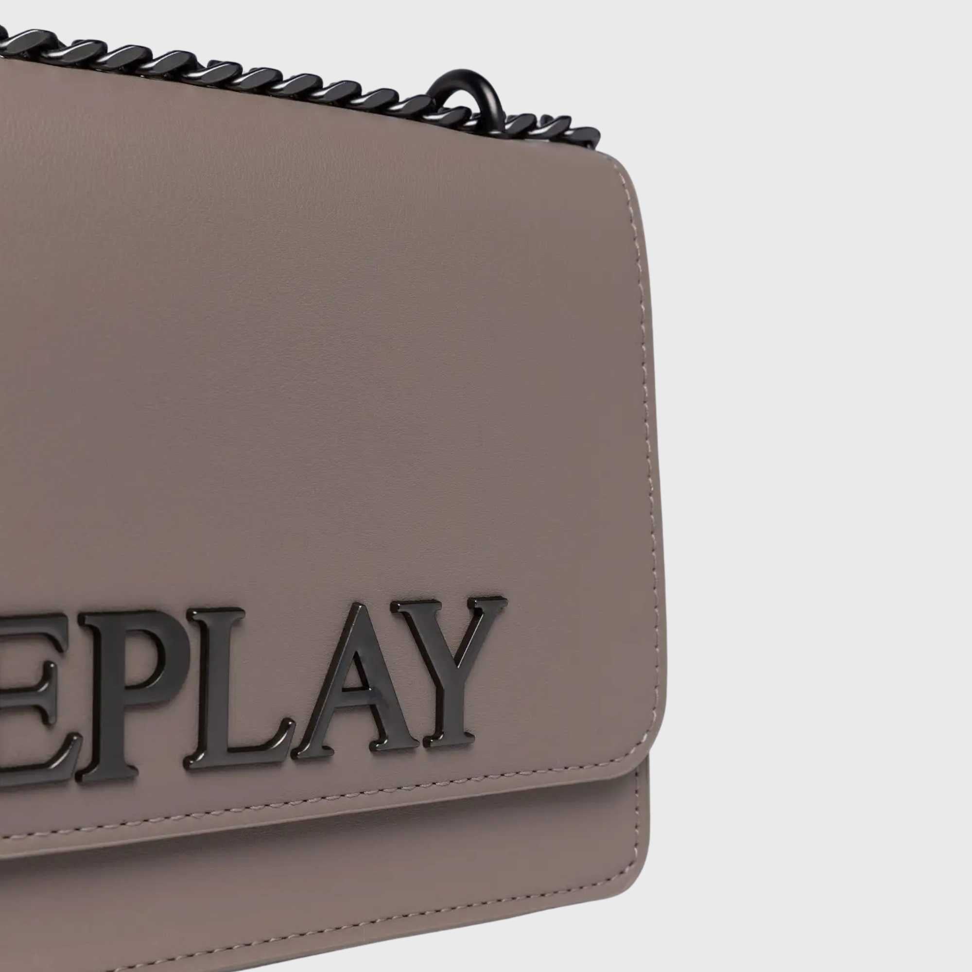Einfarbige Tasche in gewalkter Optik mit Kettenschulterriemen mit passendem, verstellbarem, mit Sternen verziertem Schultergurt. Das Modell hat einen Überschlag mit Magnetknopf und einen Replay-Schriftzug aus Metall auf der Vorderseite.