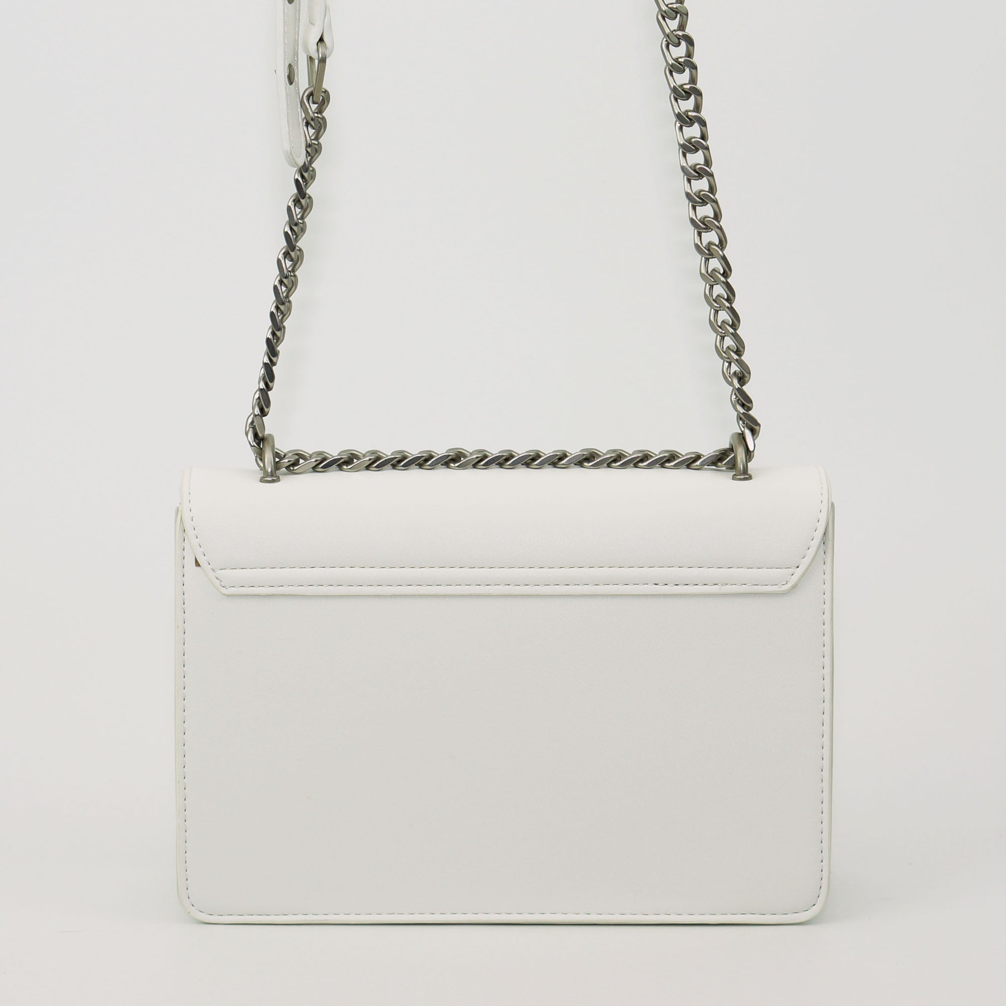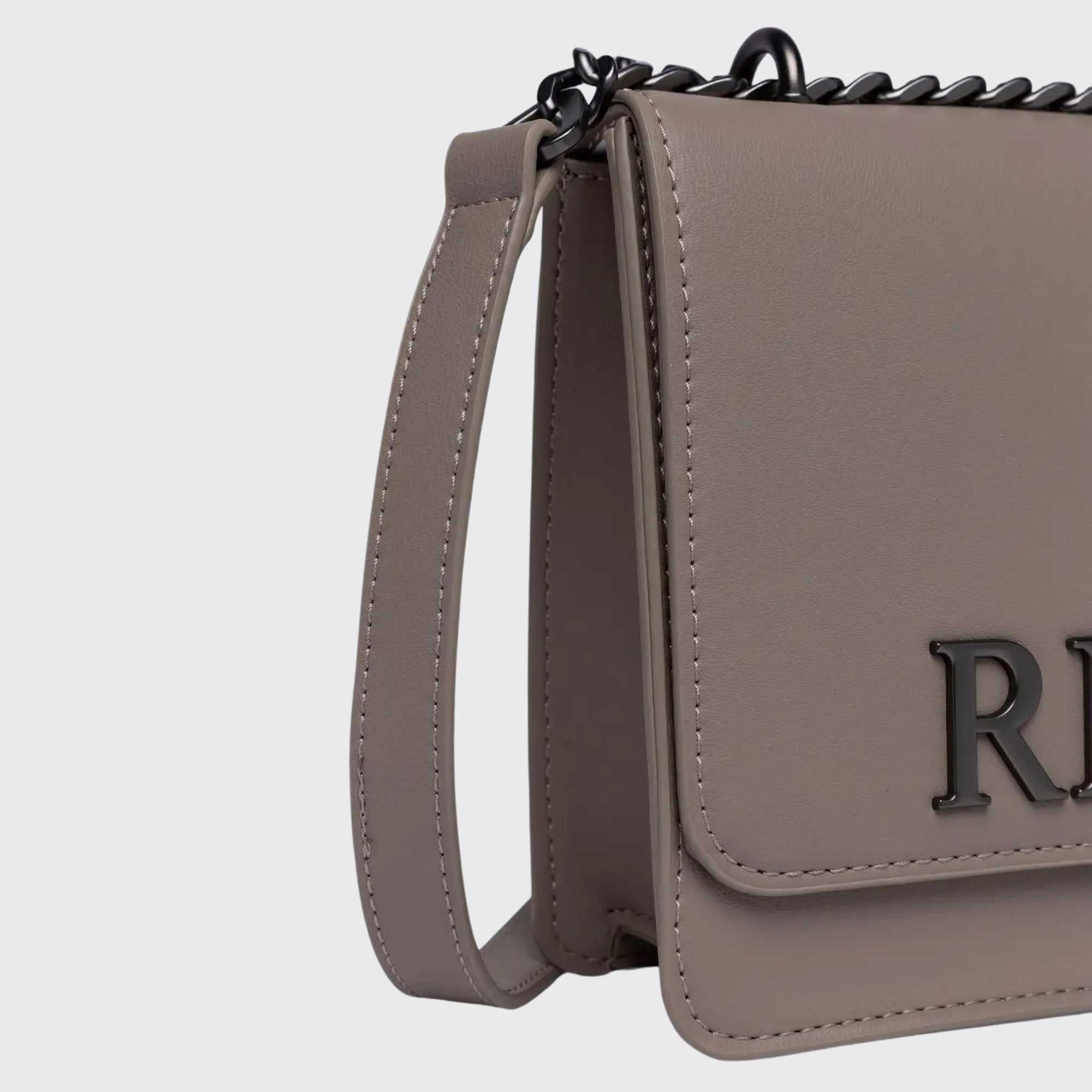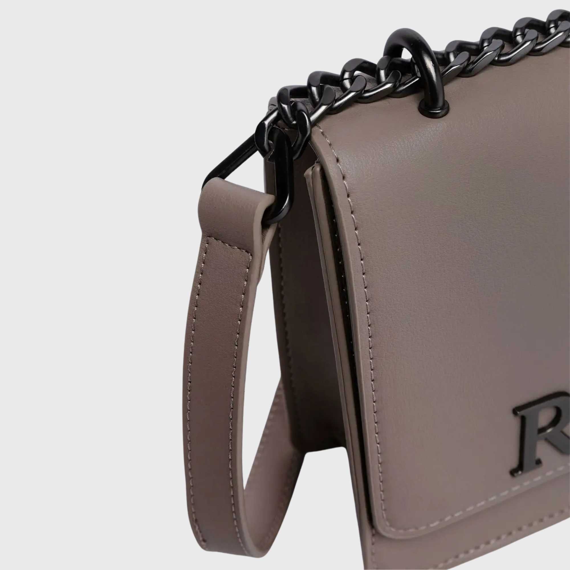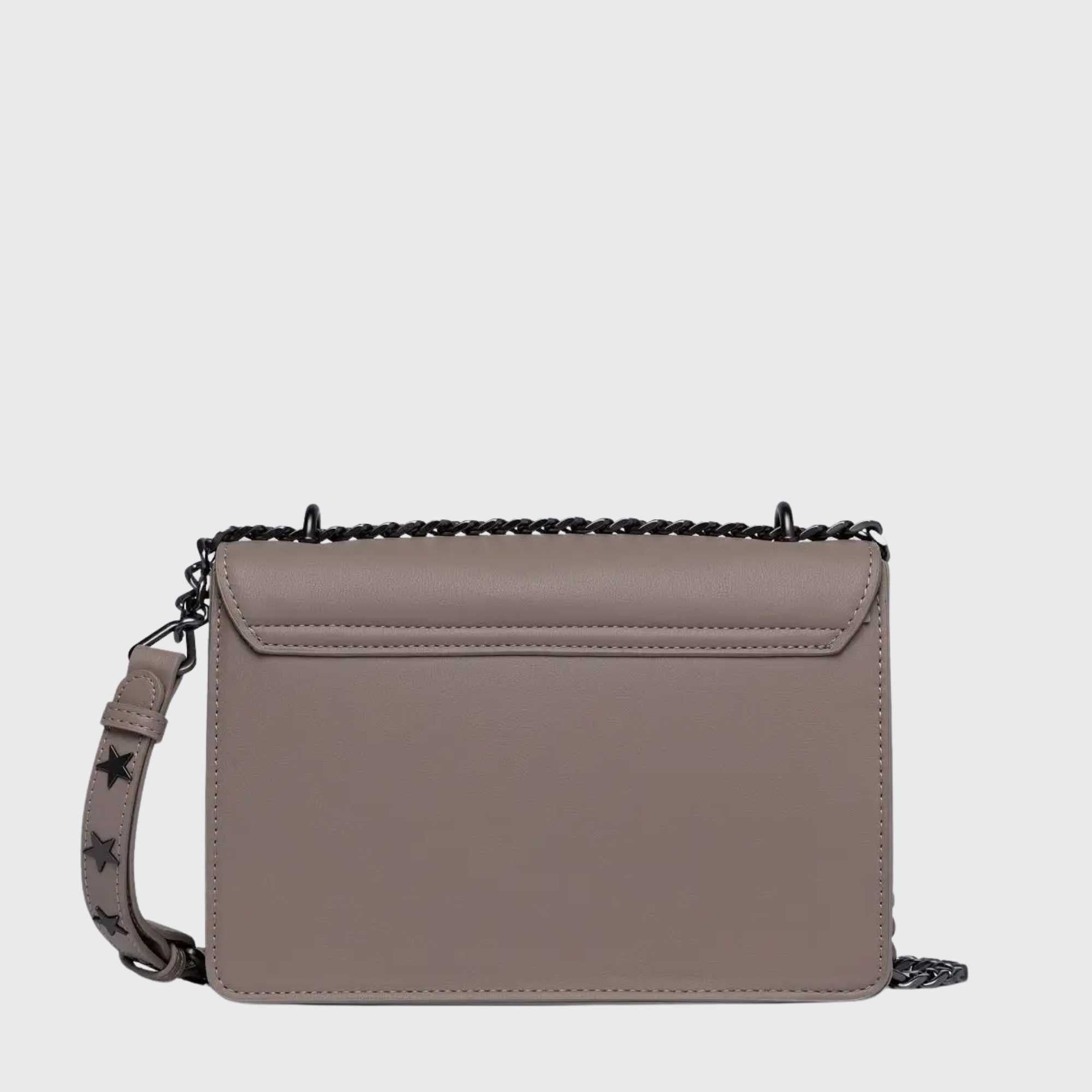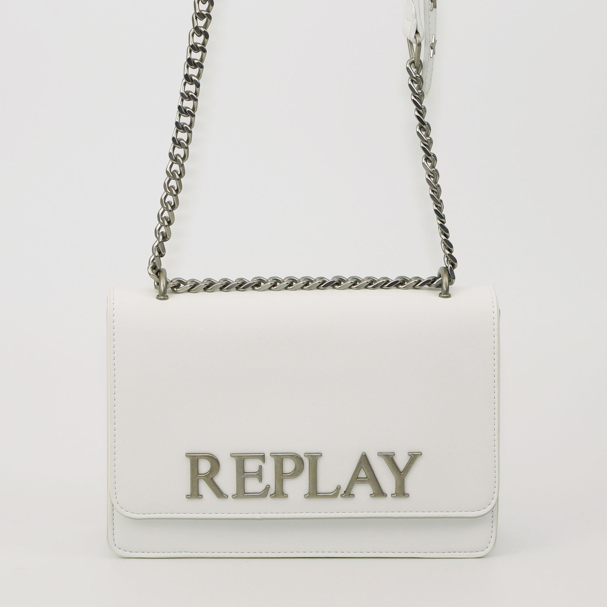 Einfarbige Tasche in gewalkter Optik mit Kettenschulterriemen mit passendem, verstellbarem, mit Sternen verziertem Schultergurt. Das Modell hat einen Überschlag mit Magnetknopf und einen Replay-Schriftzug aus Metall auf der Vorderseite.