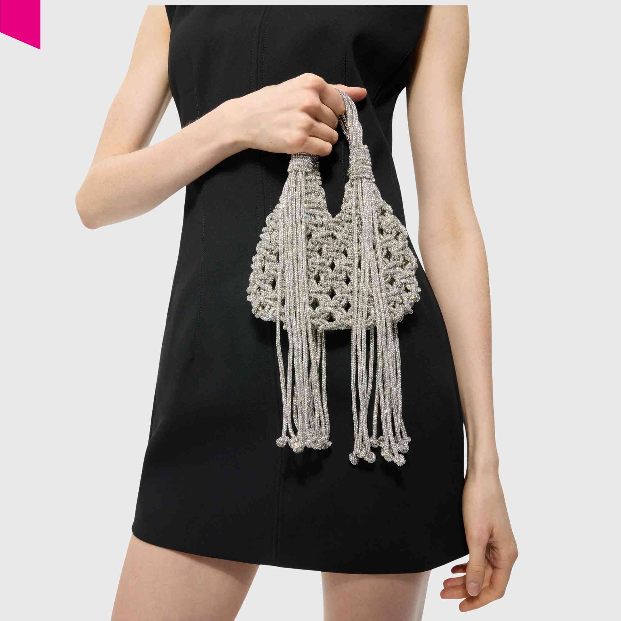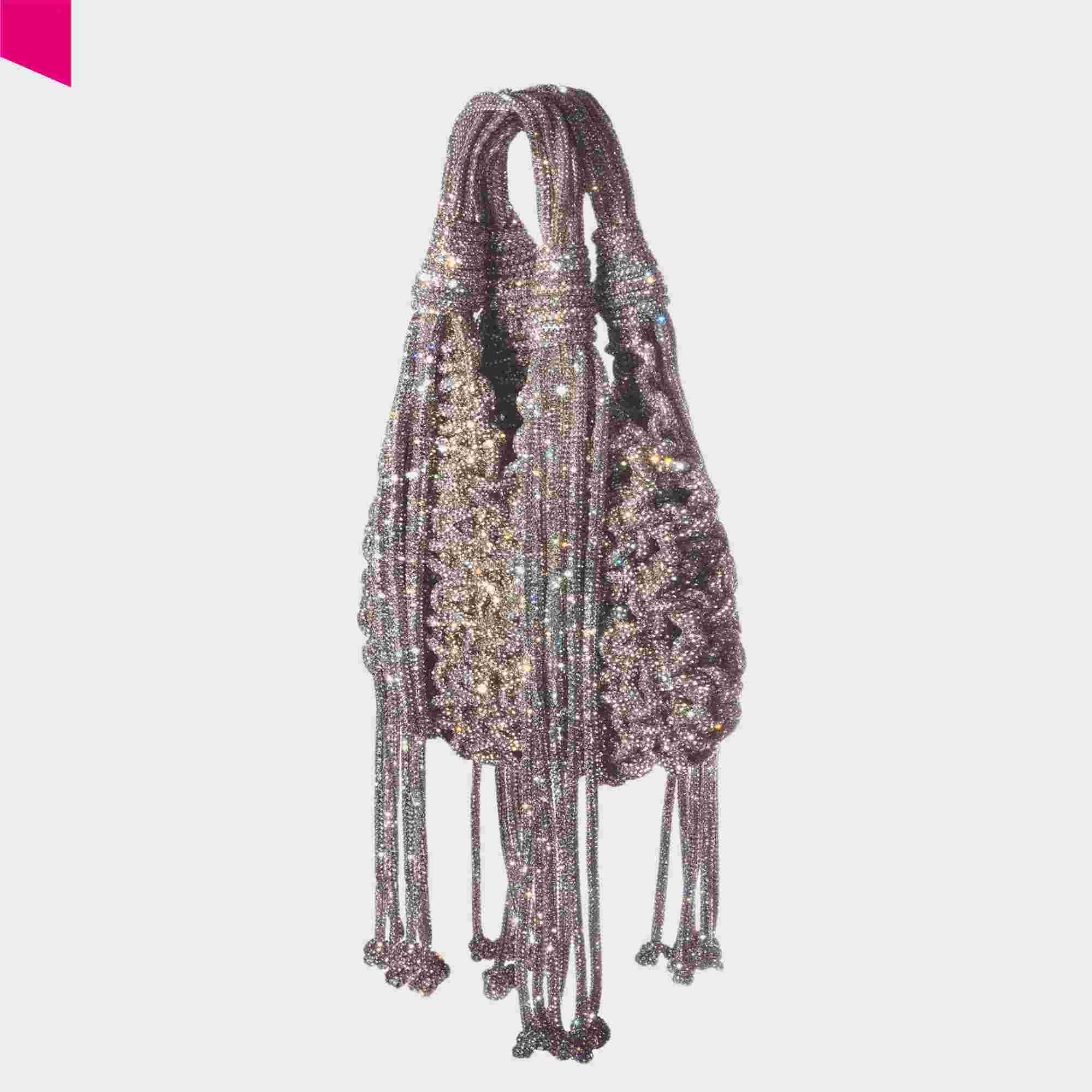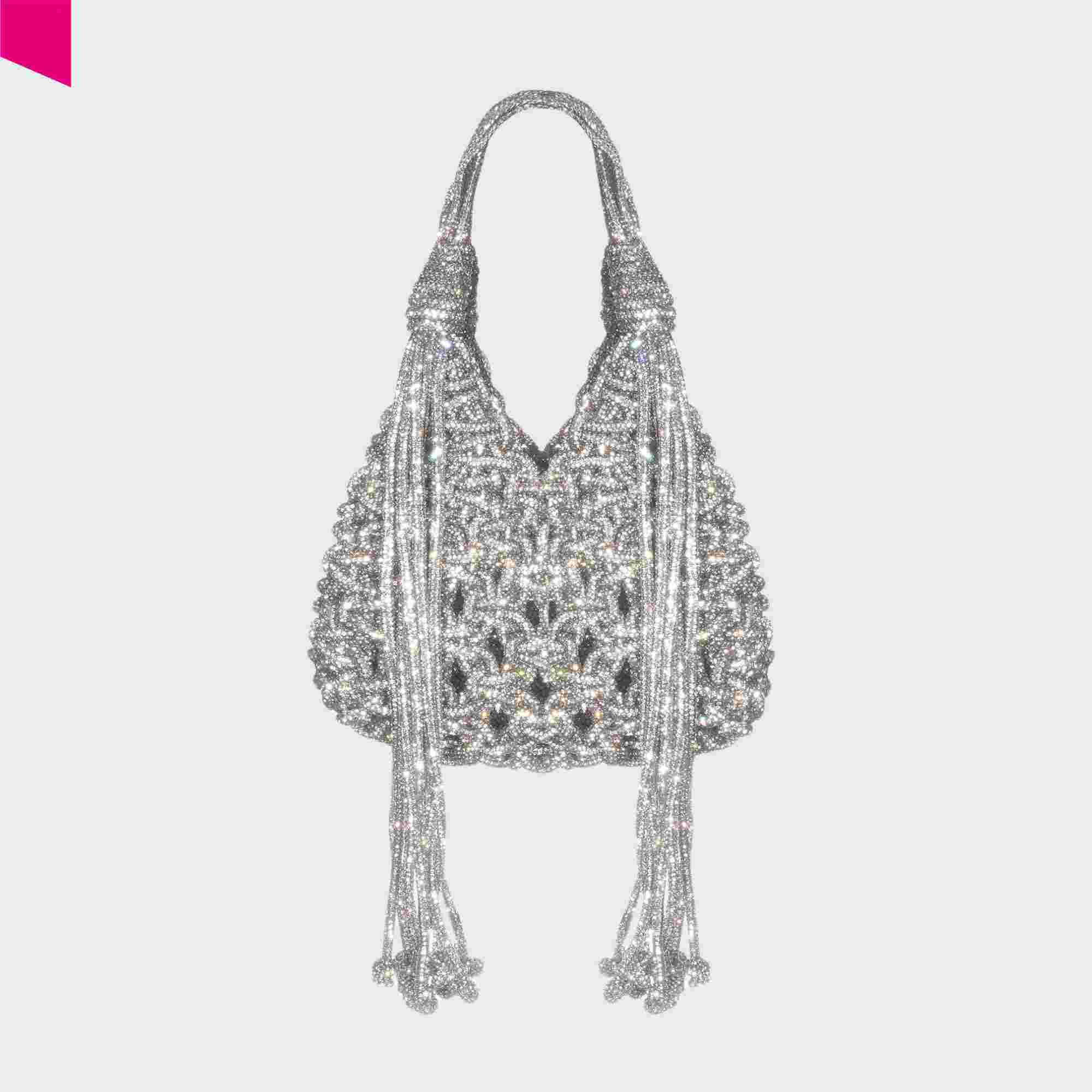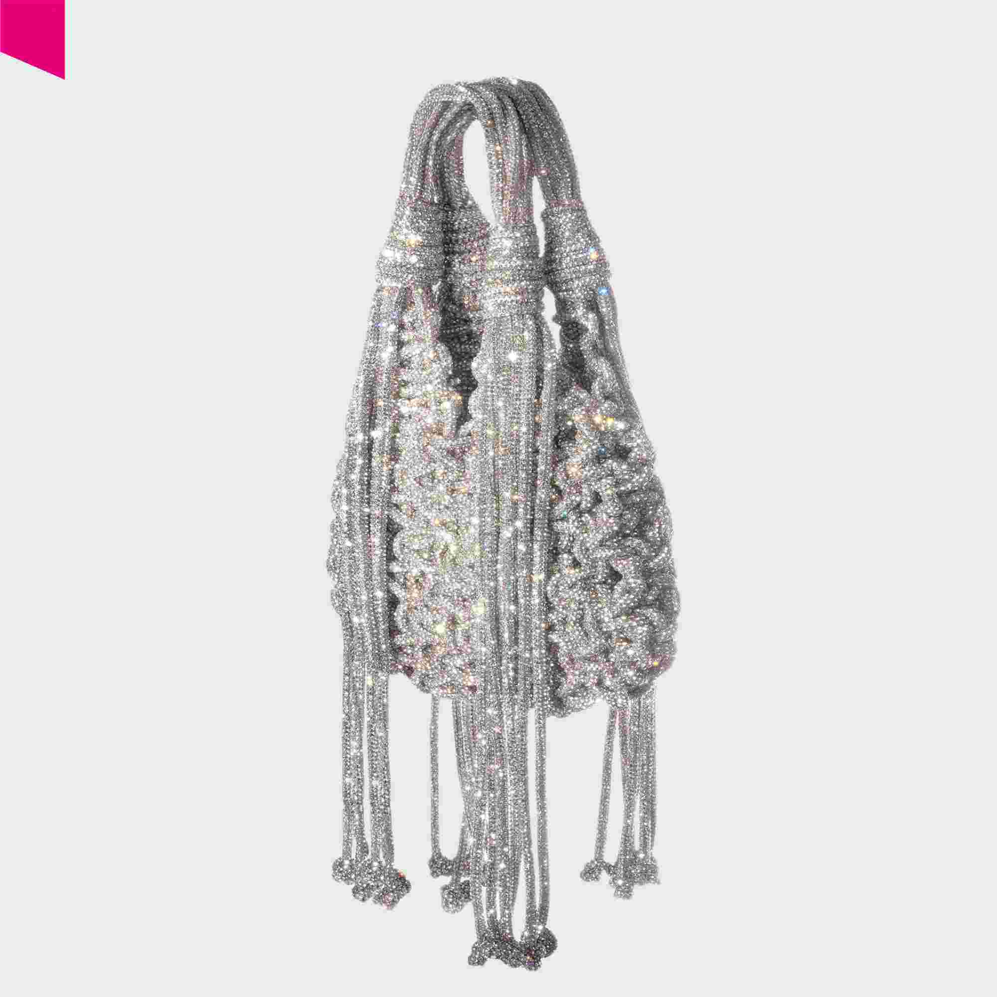 Die VANNIFIQUE MINI PENDANT Handtasche von HIBOURAMA ist eine elegante Designer Tasche mit ikonischer Flechtstruktur und funkelnden Kristalldetails. Die fließenden Fransen verleihen der Tasche Bewegung und unterstreichen den modernen, luxuriösen Look.