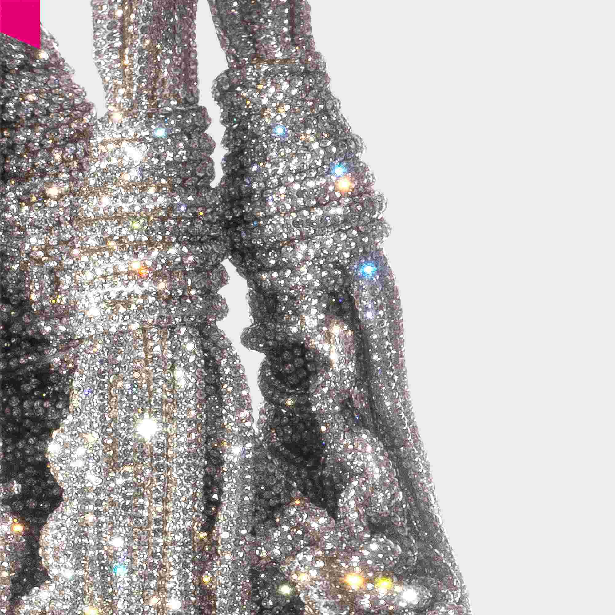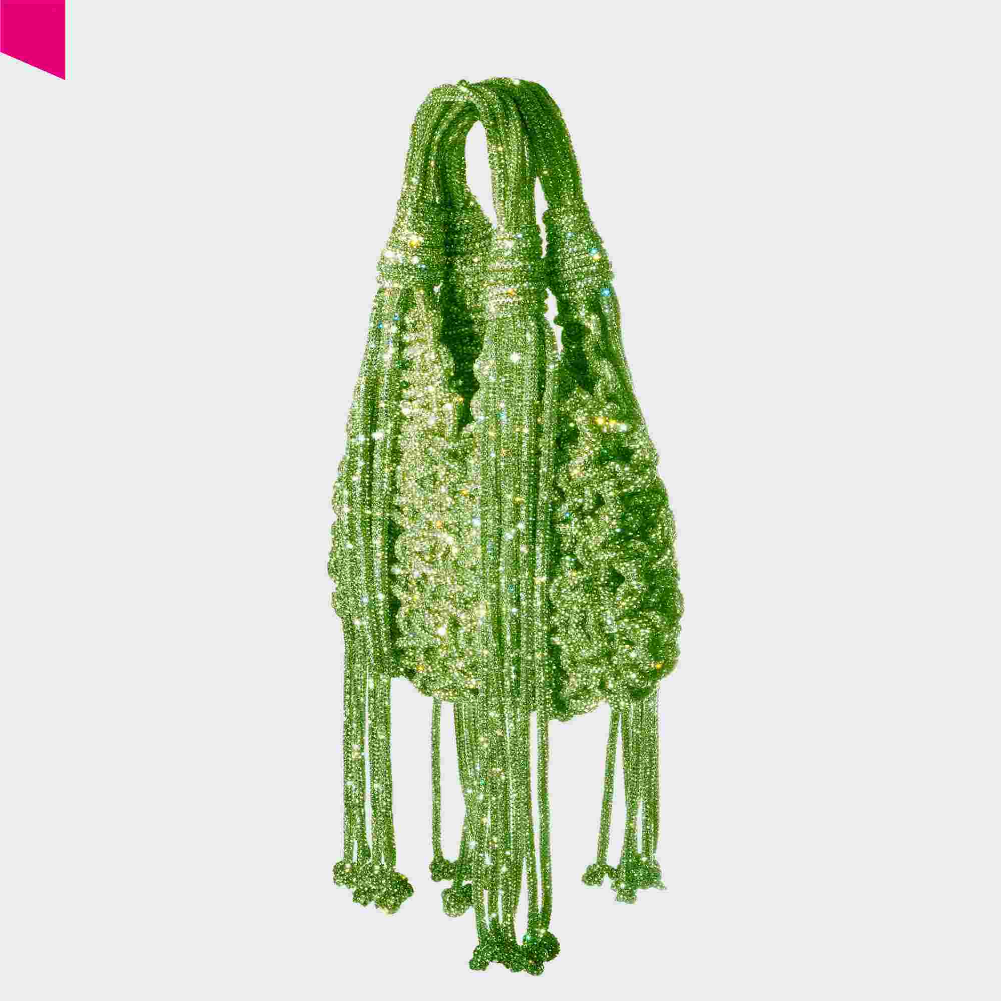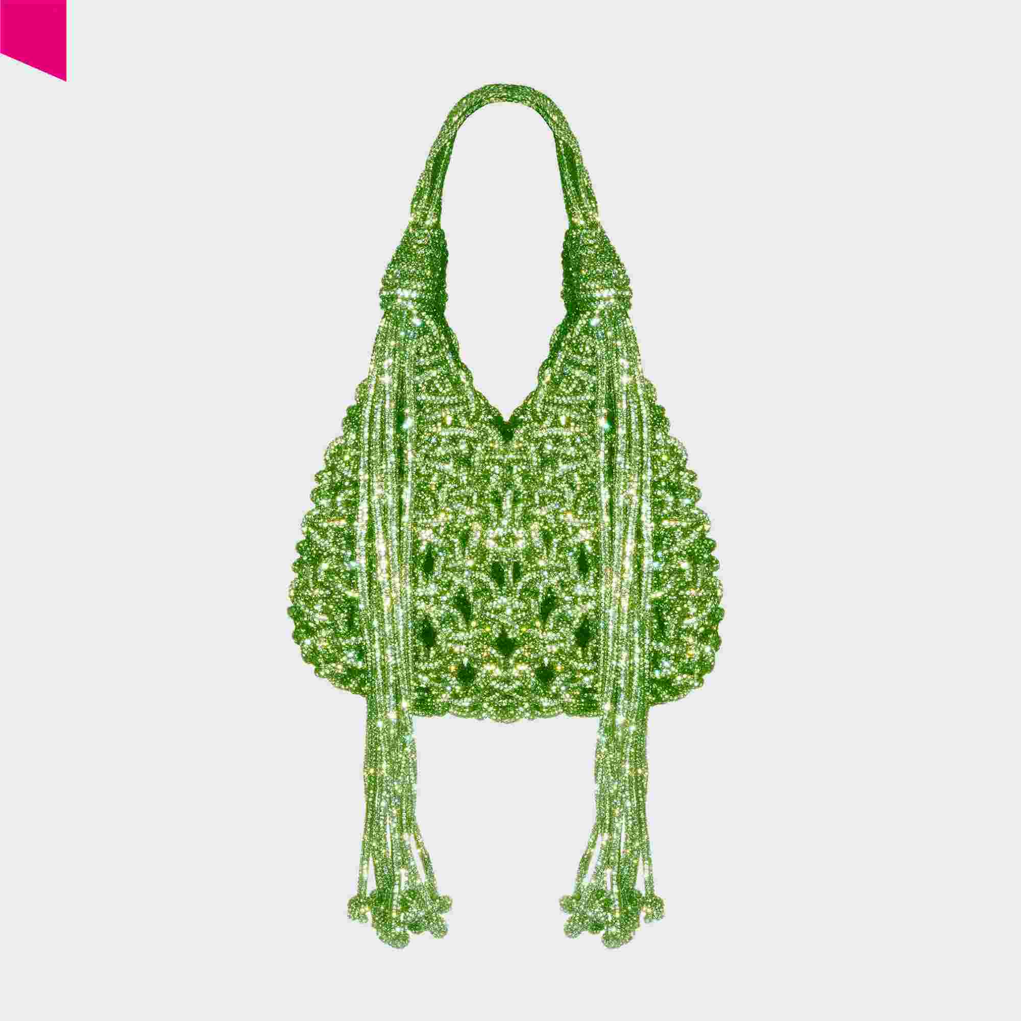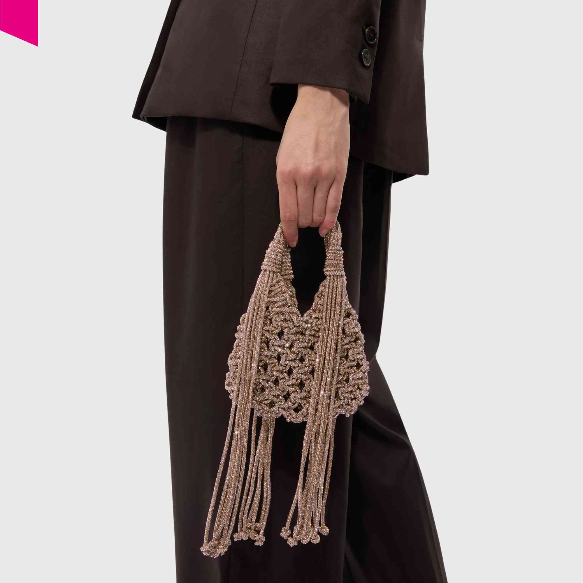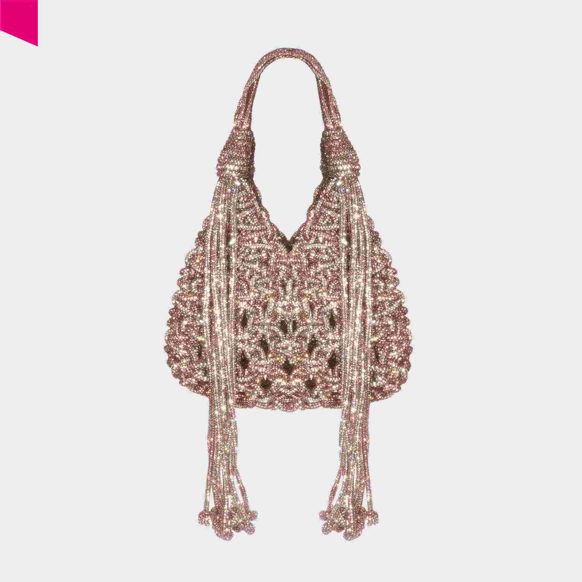 Die VANNIFIQUE MINI PENDANT Handtasche von HIBOURAMA ist eine elegante Designer Tasche mit ikonischer Flechtstruktur und funkelnden Kristalldetails. Die fließenden Fransen verleihen der Tasche Bewegung und unterstreichen den modernen, luxuriösen Look.