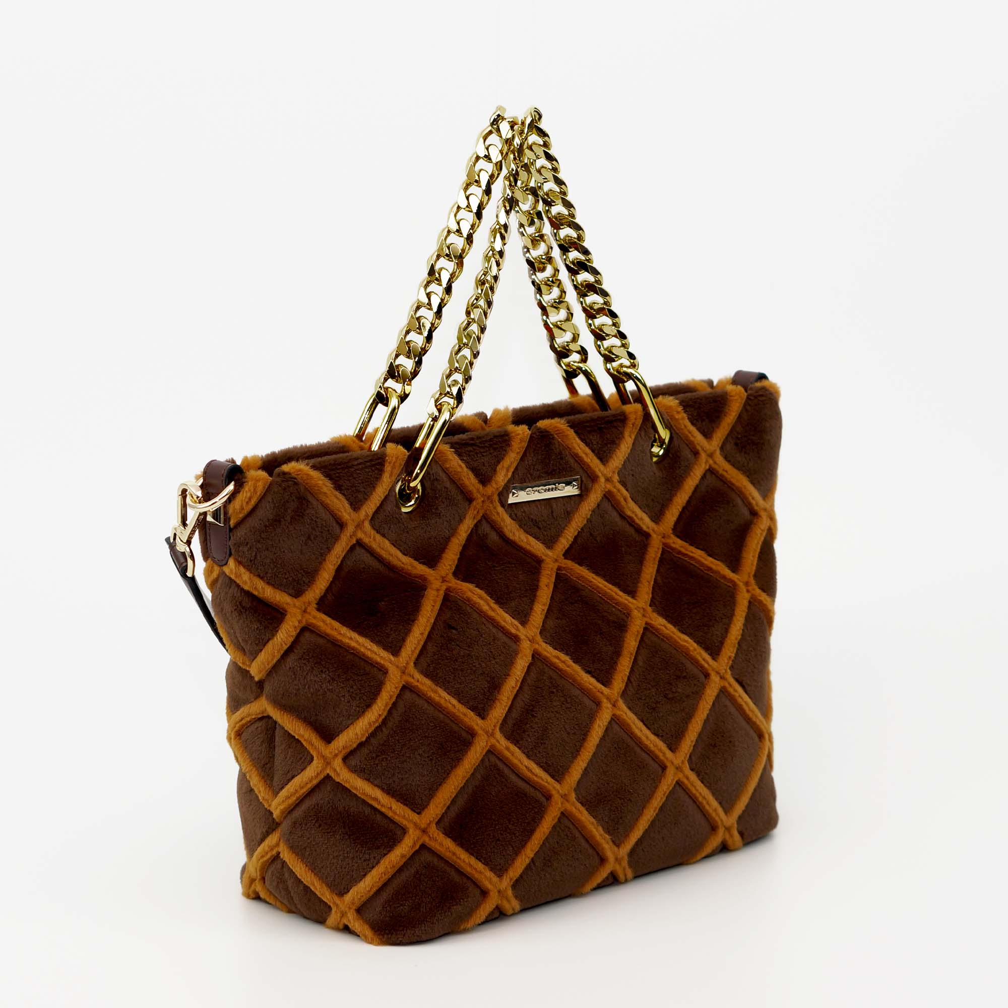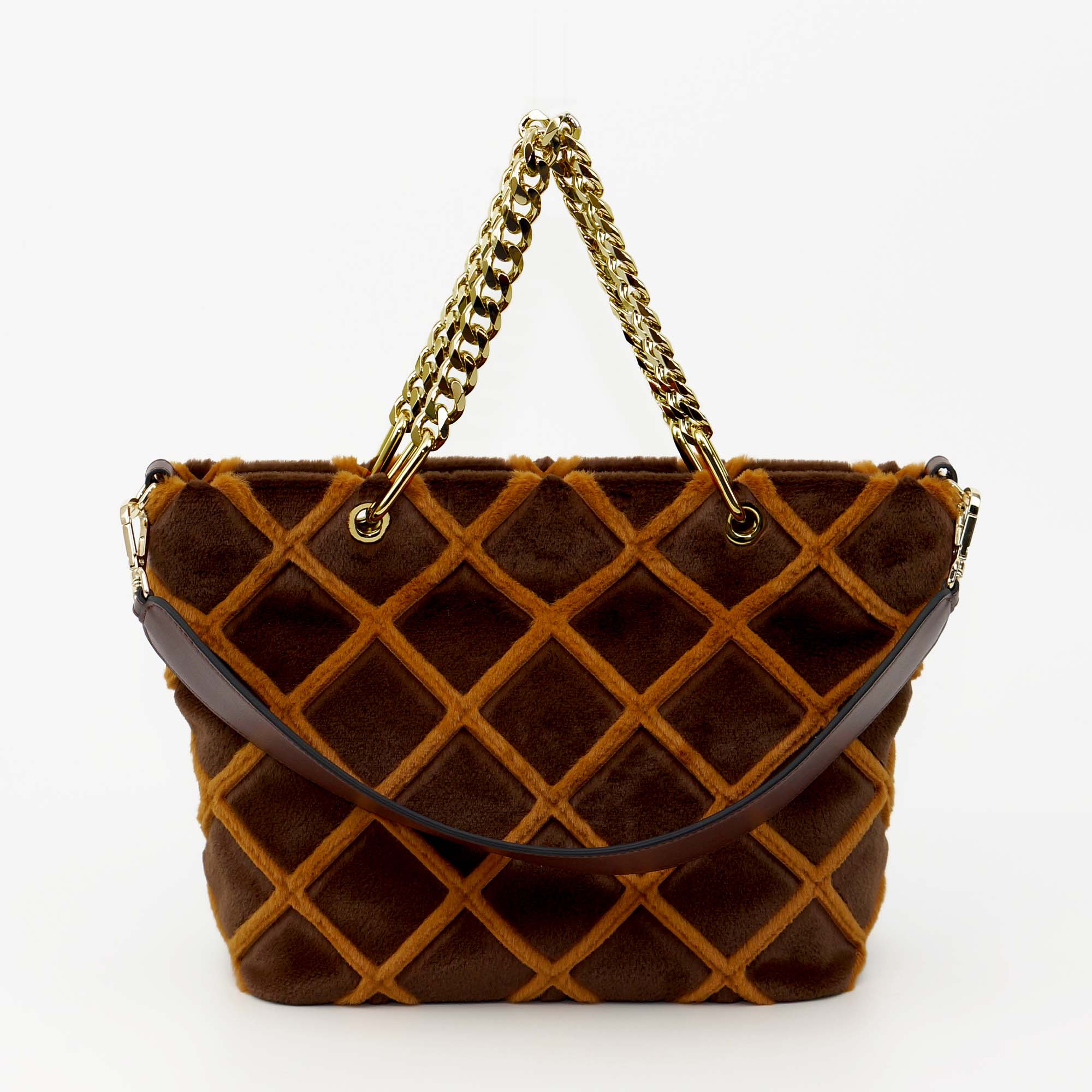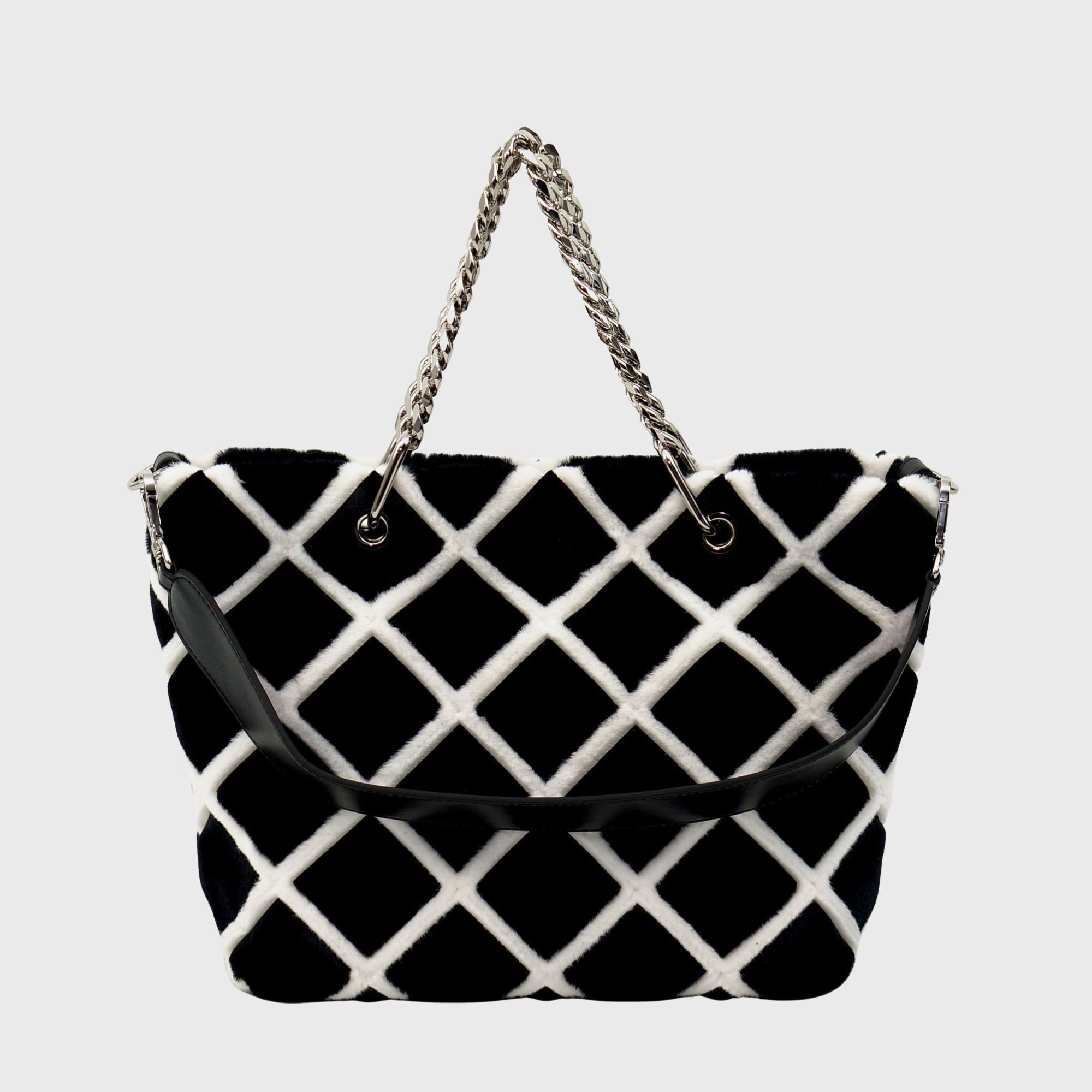 Diese Handtasche mit Kettenhenkeln vereint Eleganz und Funktionalität. Gefertigt aus einem Material mit Felloptik und raffiniertem Diamantmuster, wird sie durch die silberfarbenen Details perfekt abgerundet. Neben den Kettenhenkeln verfügt die Tasche über einen praktischen Schulterriemen, der für vielseitige Tragemöglichkeiten sorgt. Ideal für stilbewusste Frauen, die ein edles Accessoire mit modernem Touch suchen.