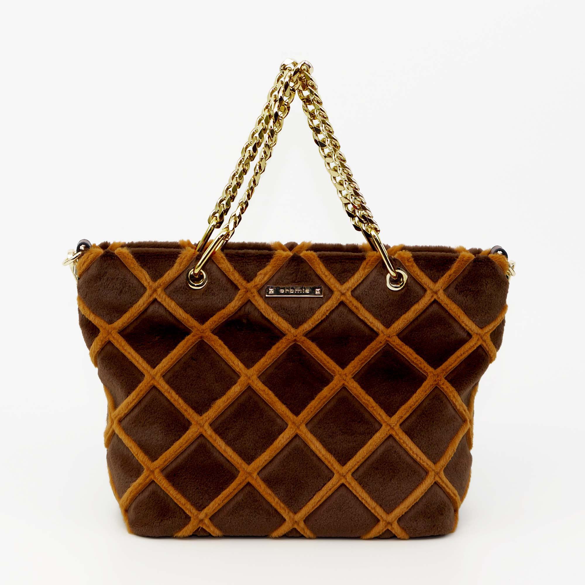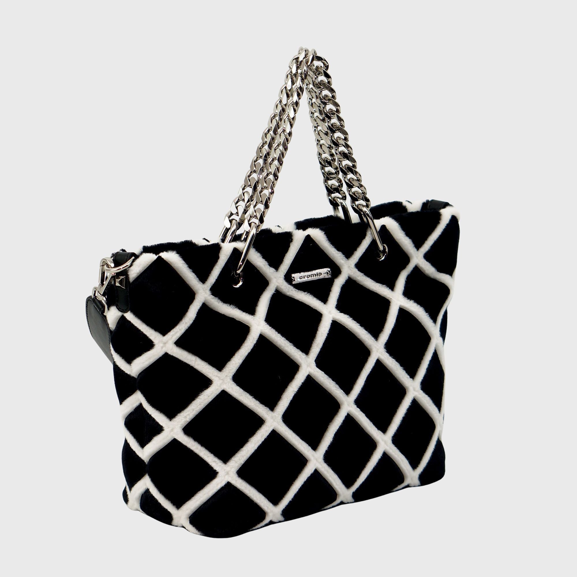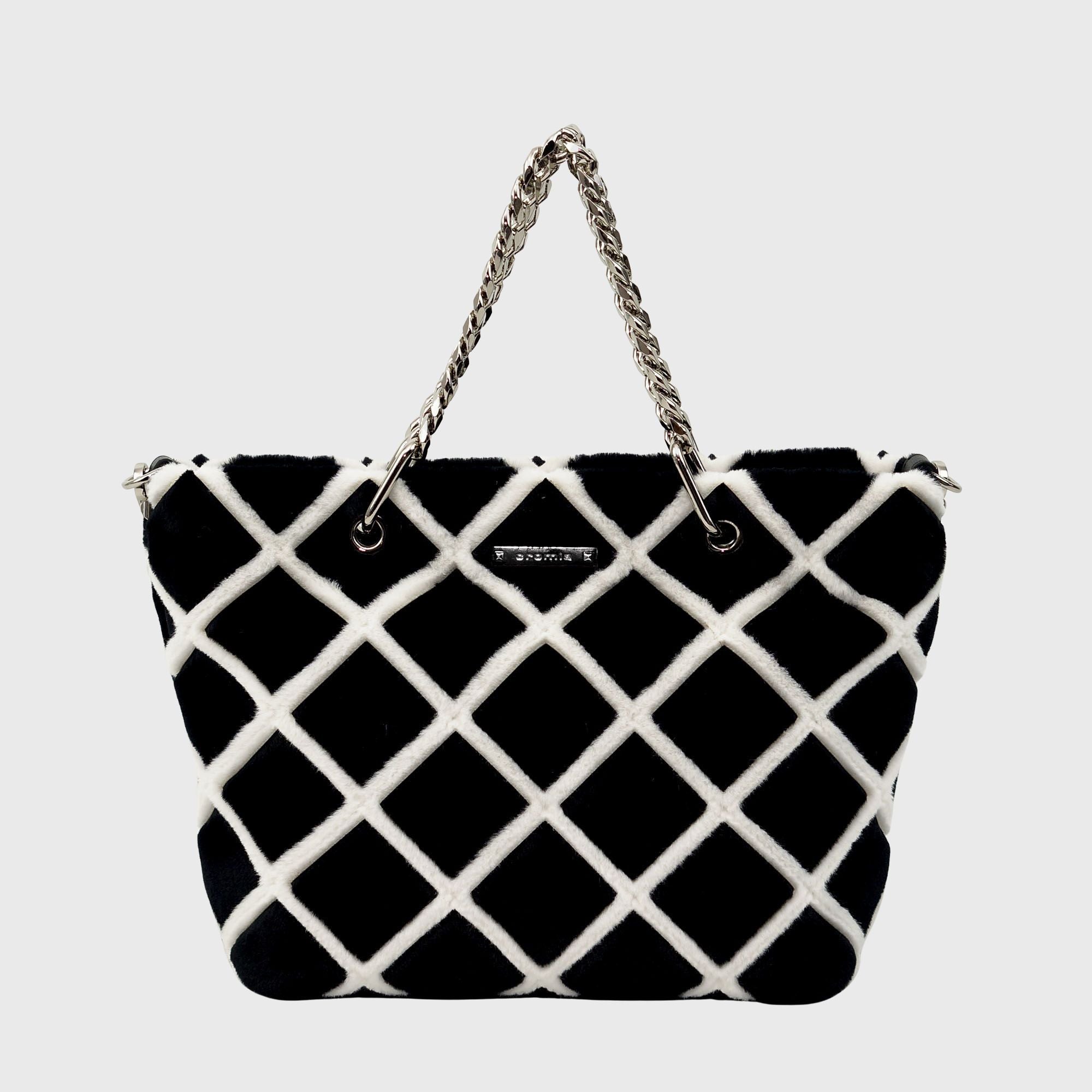 Diese Handtasche mit Kettenhenkeln vereint Eleganz und Funktionalität. Gefertigt aus einem Material mit Felloptik und raffiniertem Diamantmuster, wird sie durch die silberfarbenen Details perfekt abgerundet. Neben den Kettenhenkeln verfügt die Tasche über einen praktischen Schulterriemen, der für vielseitige Tragemöglichkeiten sorgt. Ideal für stilbewusste Frauen, die ein edles Accessoire mit modernem Touch suchen.